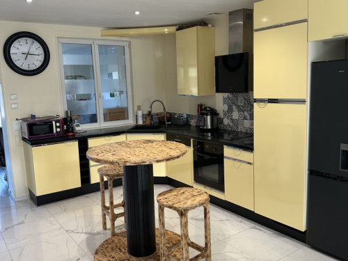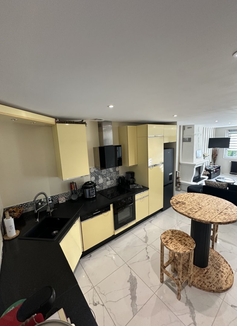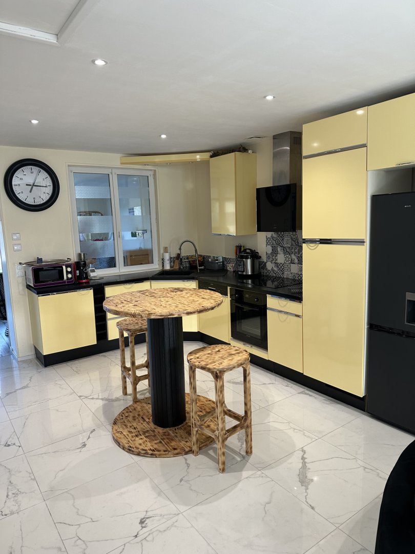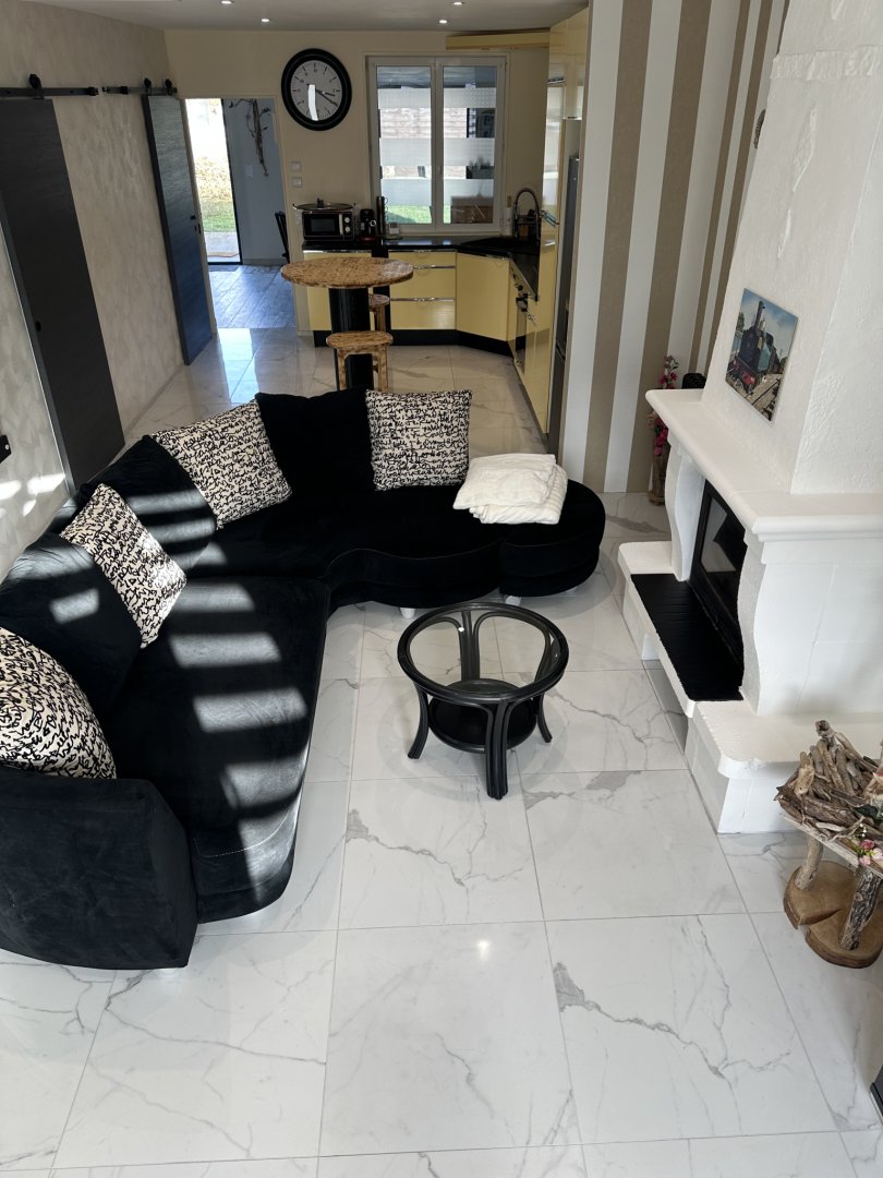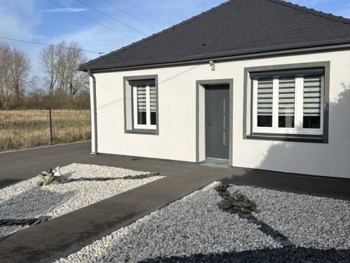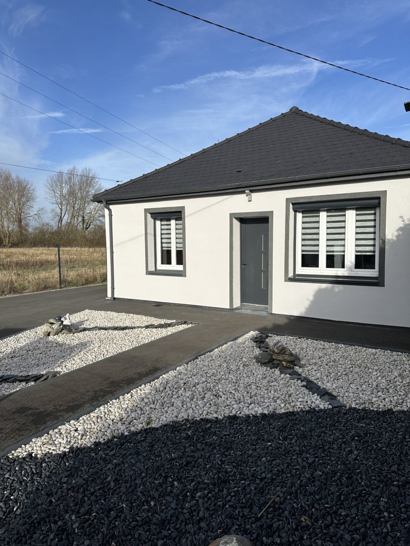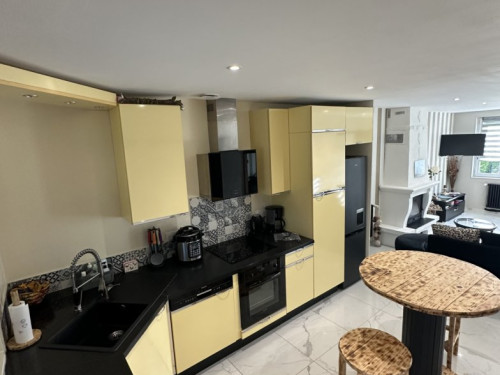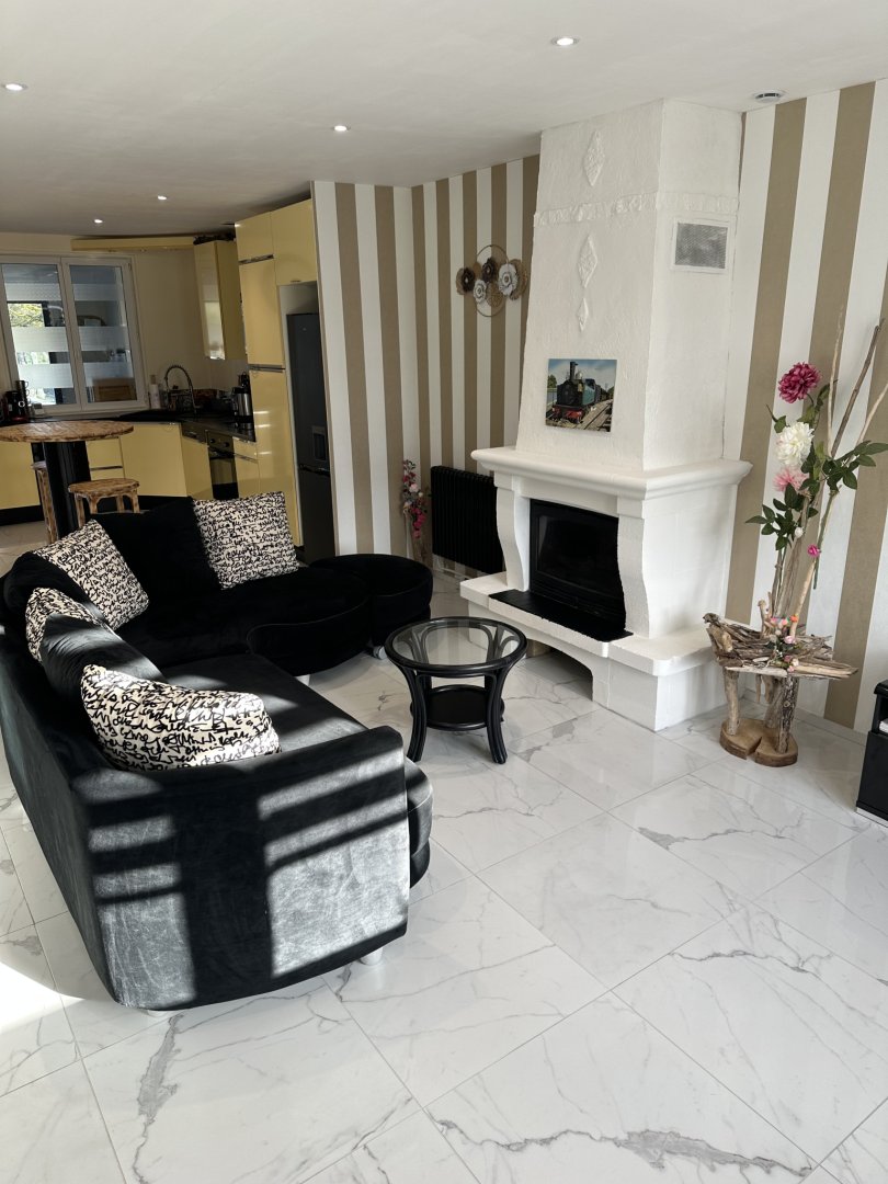 Maison de plain-pied avec une cuisine aménagée, un salon avec cheminée, une salle de bain avec douche italienne, un WC, deux chambres avec un lit grand format de 180 et deux petits lits de 90 ou un autre Grand format, une salle à manger.