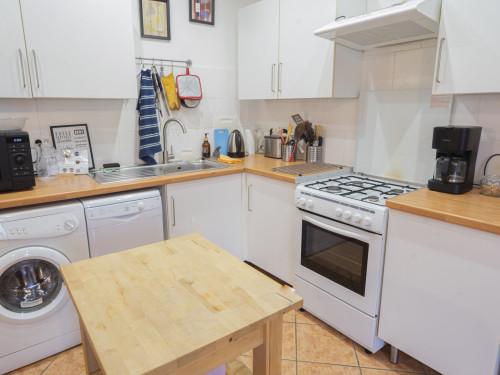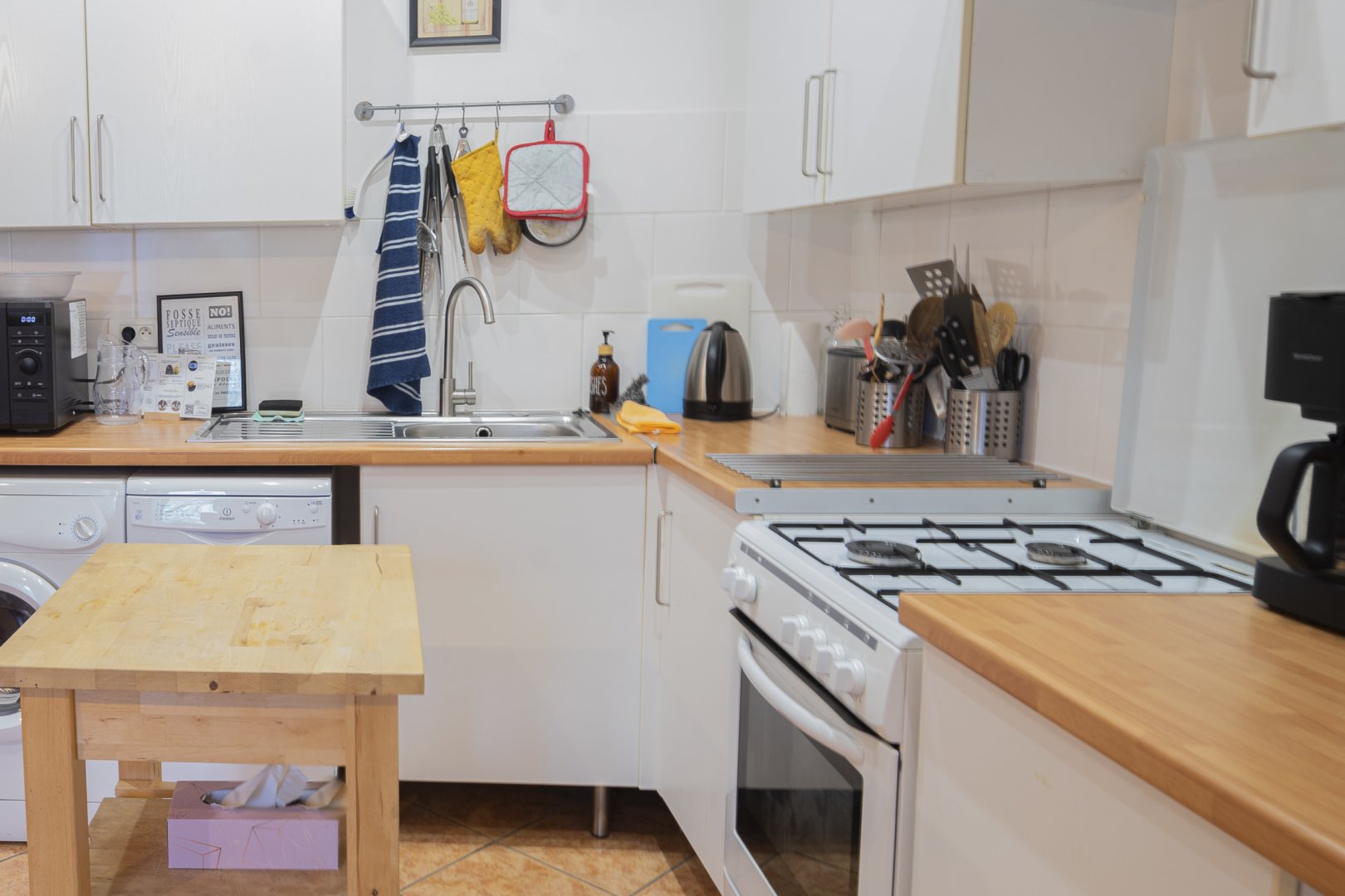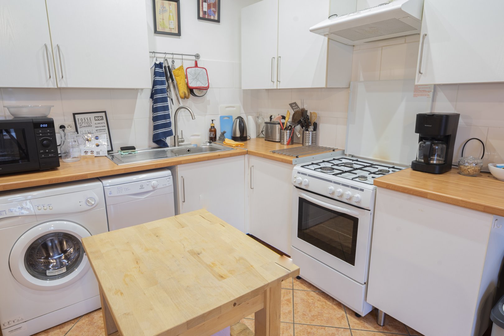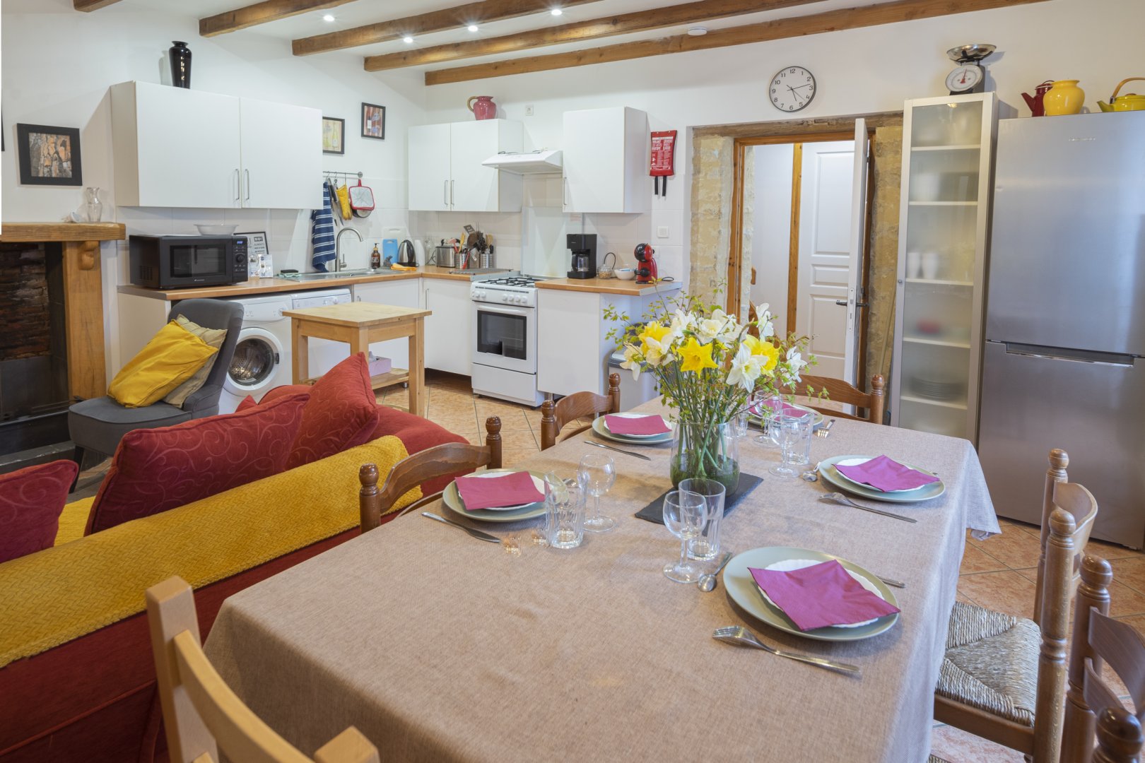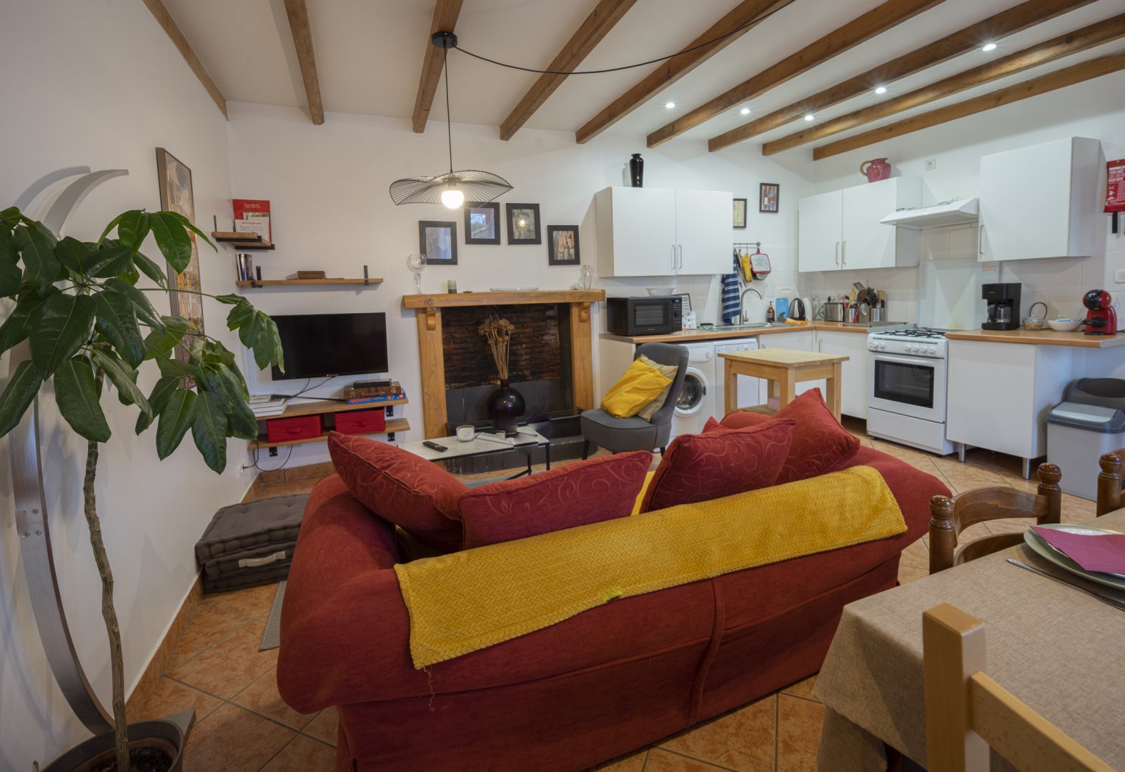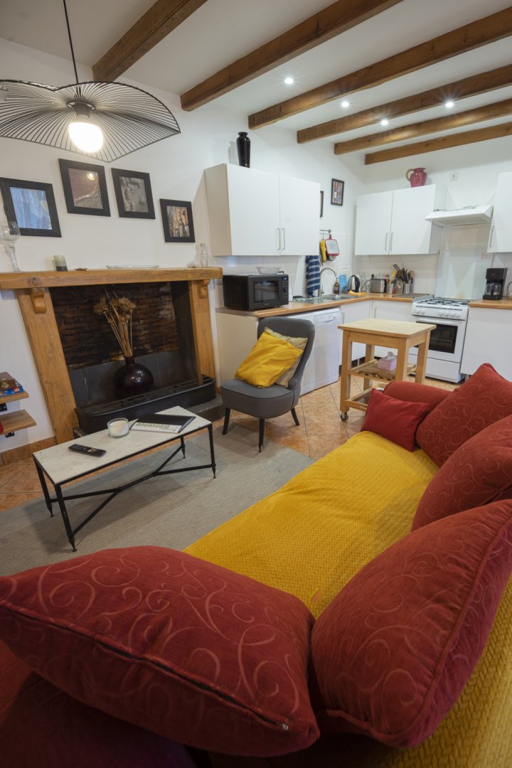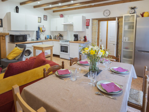- la cuisine complètement équipée (électroménager, lave-vaisselle, lave-linge) est ouverte sur l'espace salon / salle à manger