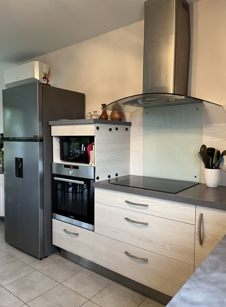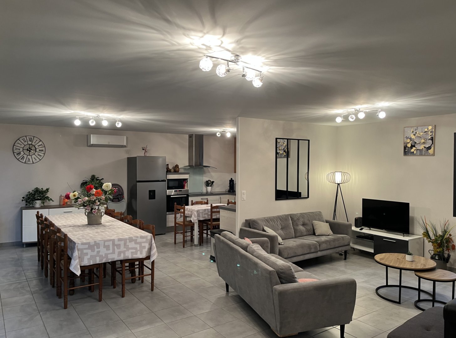 Le rez-de-chaussée dispose d'un entrée / salon et d'une cuisine ouverte sur l'espace repas avec un accès direct sur la terrasse.