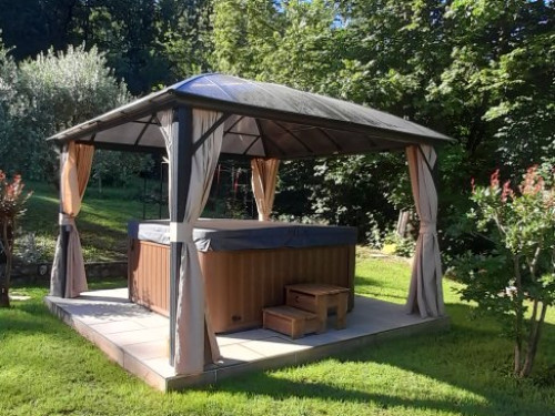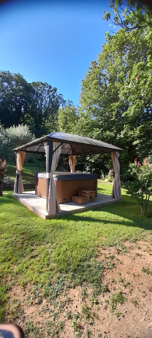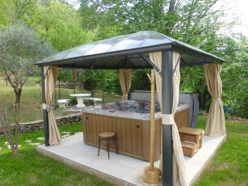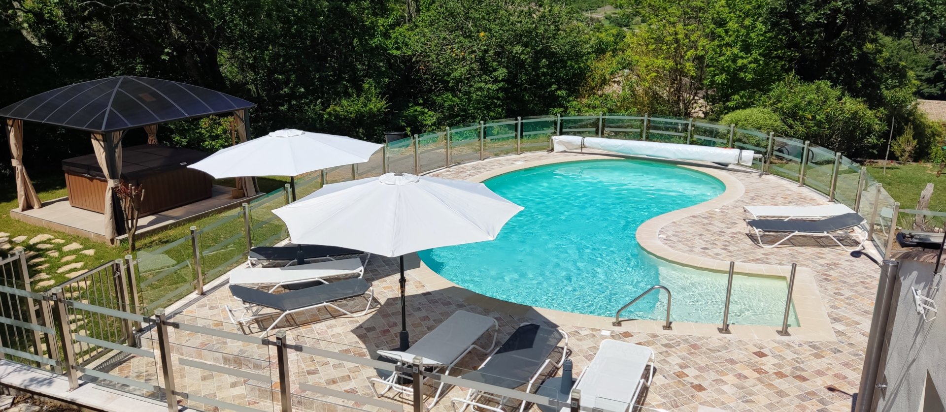 Terrasses en partie couvertes sur l'arrière de la maison, Piscine chauffée solaire forme libre, SPA, Barbecue,