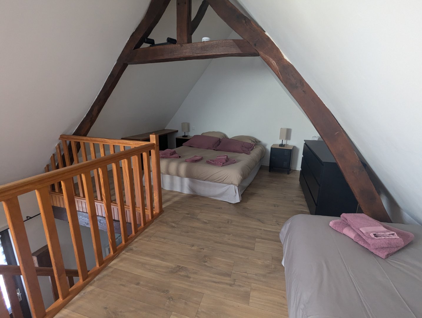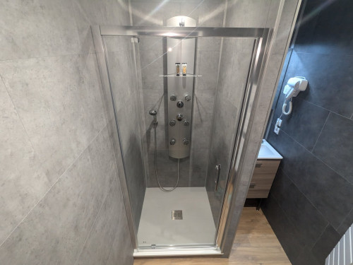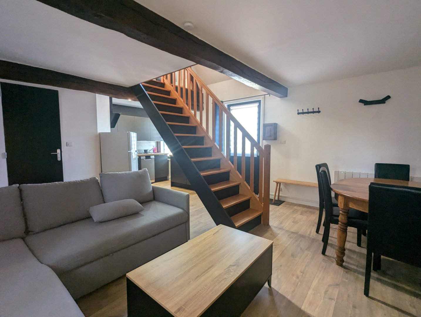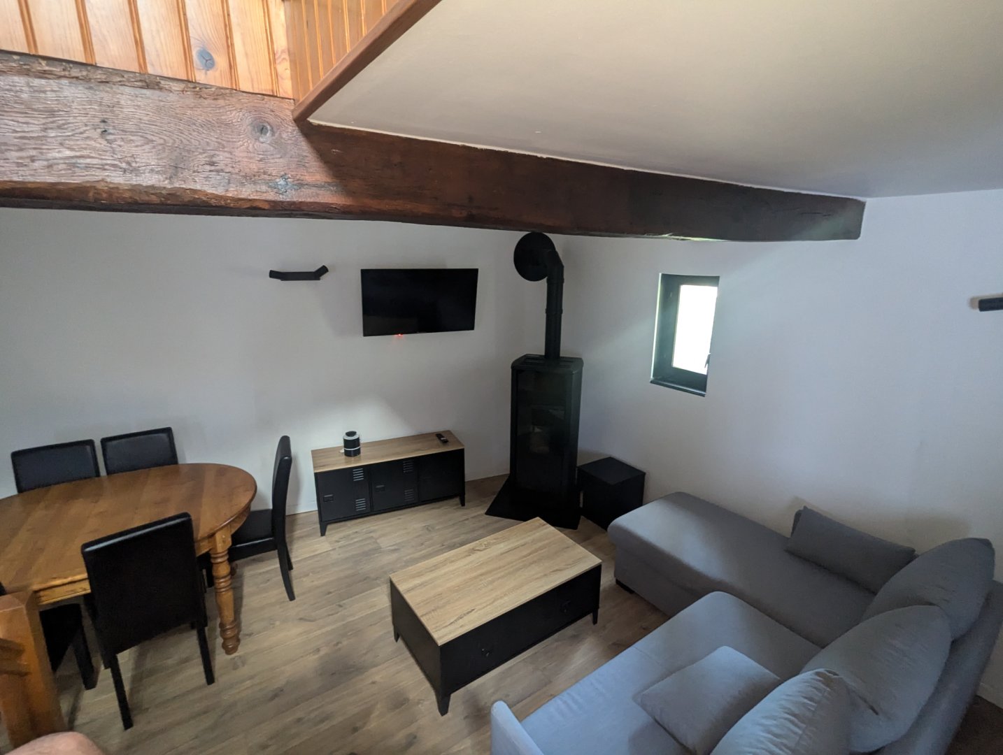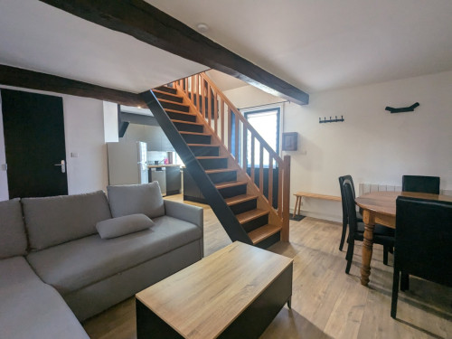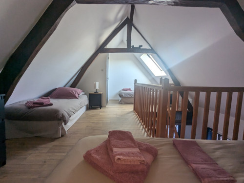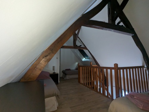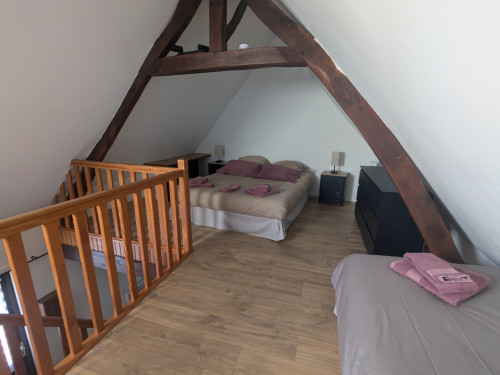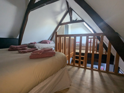L’appartement comprend une mezzanine équipée d’un lit double (160 cm) et de deux lits simples. Au rez-de-chaussée, vous trouverez une cuisine entièrement équipée avec réfrigérateur, lave-vaisselle, four, plaque vitrocéramique, cafetière à dosette et filtre, bouilloire, grille-pain, micro-ondes et vaisselle. Le salon, convivial et lumineux, dispose d’un canapé-lit pouvant accueillir deux personnes supplémentaires, d’une télévision écran plat et d’un poêle à pellets pour profiter d’une ambiance chaleureuse lors des soirées plus fraîches. Un chauffage électrique est également disponible. La salle de bain est équipée d’une grande douche hydromassante et les toilettes sont séparées.