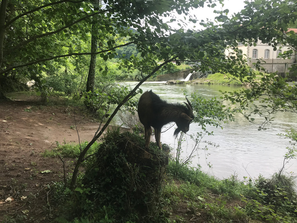 Les animaux de la ferme (poules, chèvres, chien) sont dans leurs espaces clos, mais ils peuvent parfois venir vous saluer !..