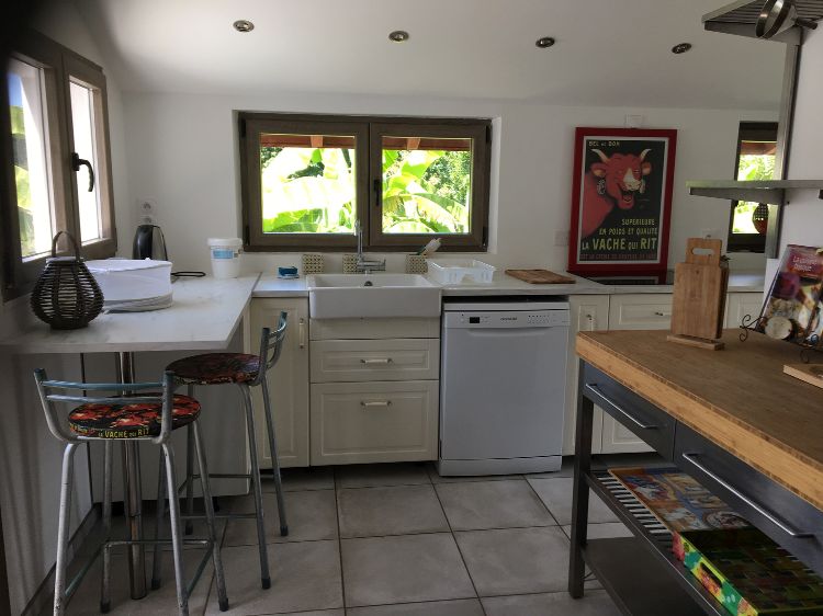 Une cuisine équipée avec terrasse (espace repas - barbecue- transats) - une salle à manger 6 couverts