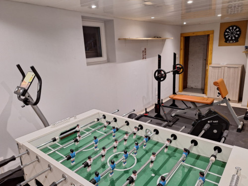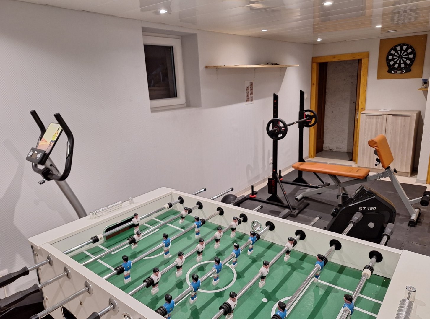 Une salle de "détente" avec baby-foot, jeu de fléchettes, rameur, vélo d'appartement.