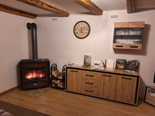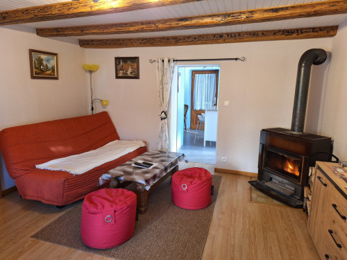 Au rez-de-chaussée : un séjour avec canapé, TV, fourneau à bois (bois fourni), jeux de société, une cuisine équipée, un coin repas, une salle d'eau, WC séparés.