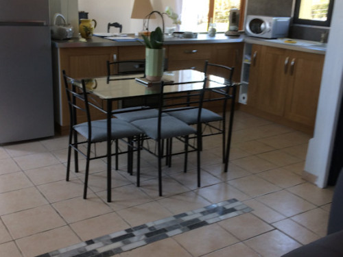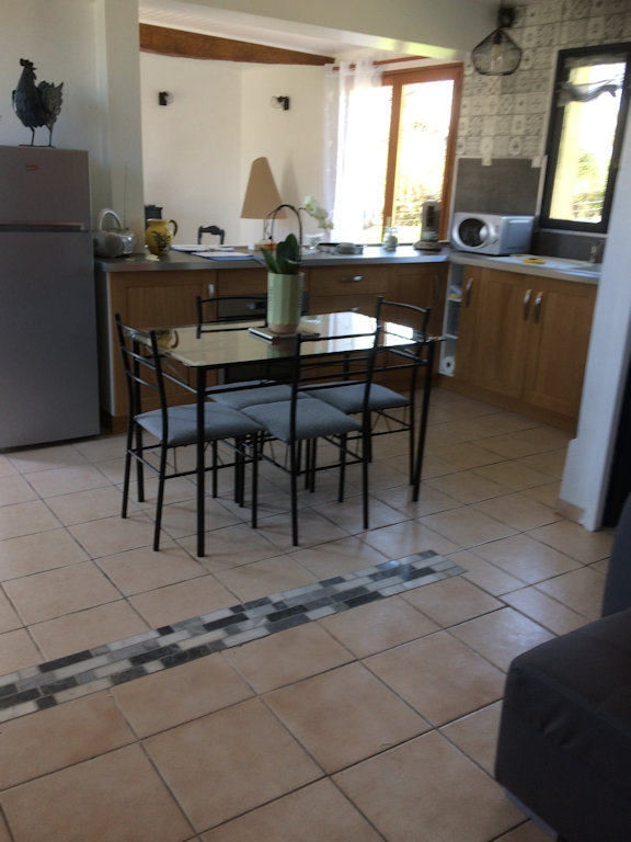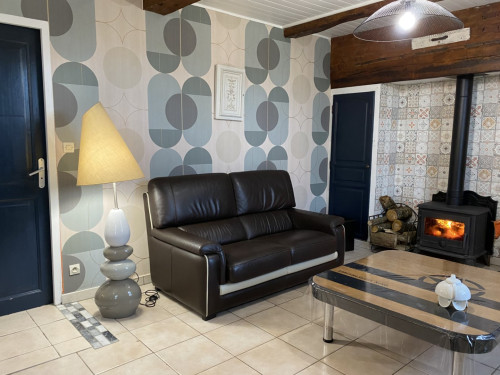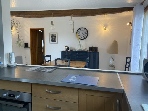 Au rez-de-chaussée : grande pièce de vie (46 m²) avec coin cuisine aménagée (réfrigérateur-congélateur), cafetière Senseo , tassimo, à filtres, grille pain, bouilloire, robot, salle à manger, salon avec poêle à bois, salle d'eau avec sèche cheveux , WC, chambre 2 personnes(lit 140) au rez-de-chaussée,