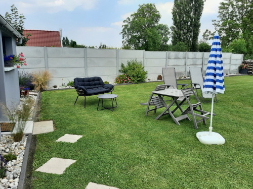 Comprend 1 chambre spacieuse donnant sur un jardin en accès libre, 1 salle de douche avec WC, un coin cuisine et repas.