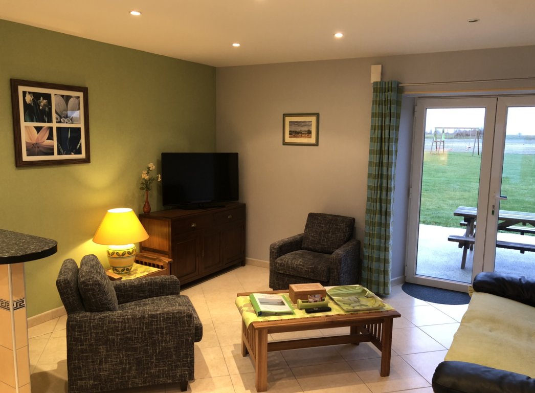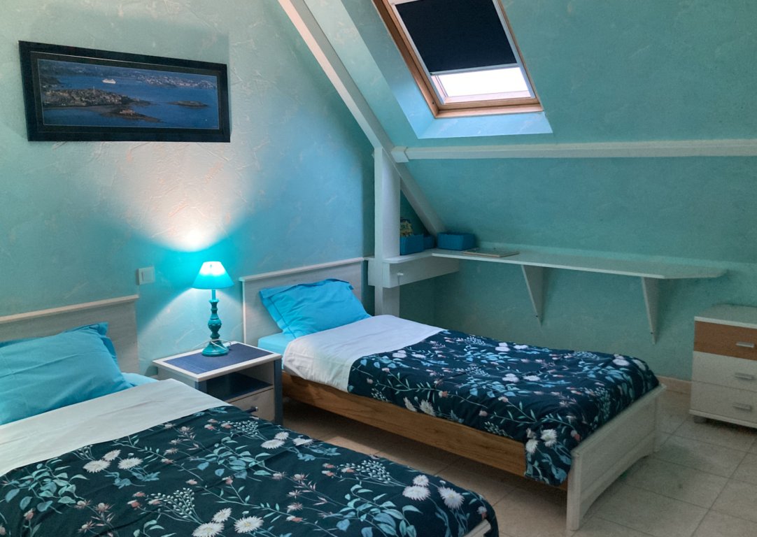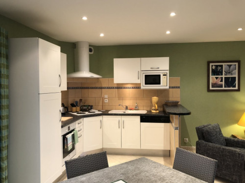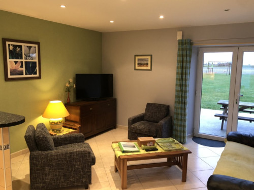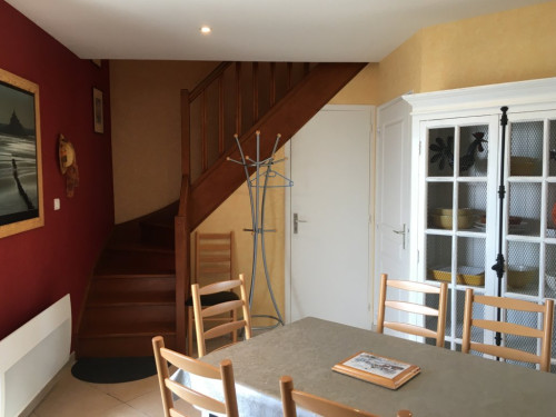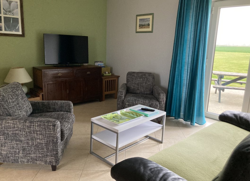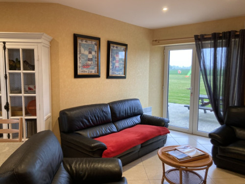 Il comprend une cuisine américaine avec un salon-séjour ouvert sur la terrasse qui offre une vue sur le Mont-Saint-Michel et un accès au parc-jardin avec aire de jeux.
