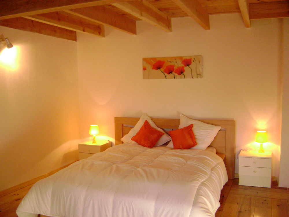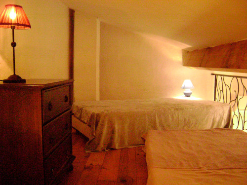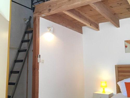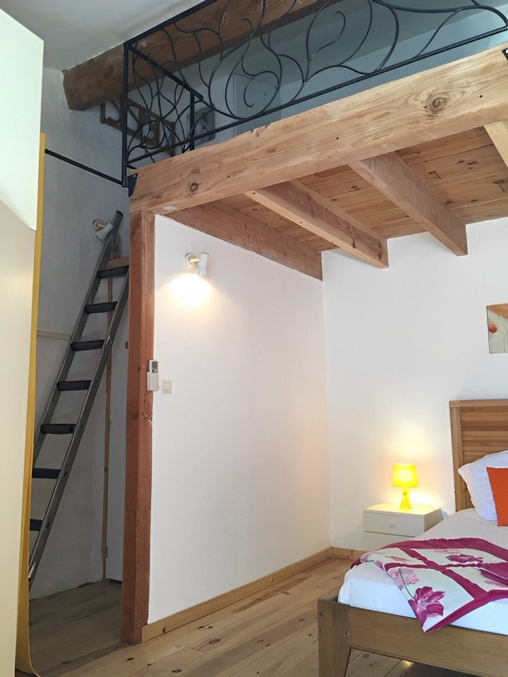 la mezzanine ouverte est accessible depuis la chambre , elle a le plafond en pente , hauteur réduit