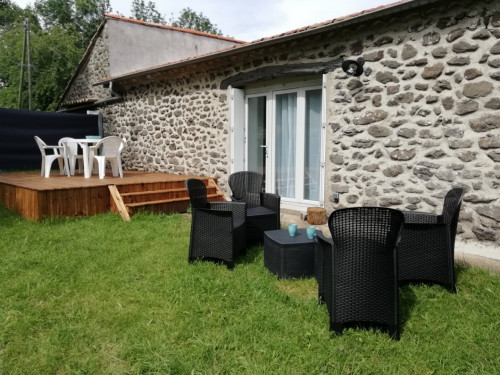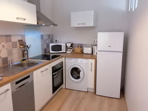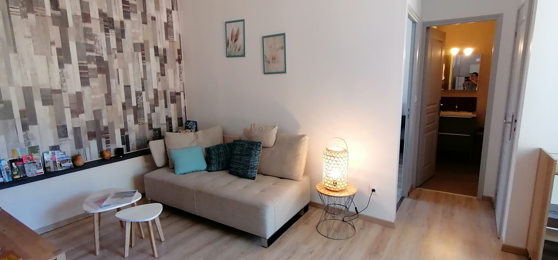 Ce gîte de 51 m², pour 4 personnes, vous accueille avec une grande pièce à vivre de 24 m², avec une cuisine toute équipée, un coin repas et son salon.