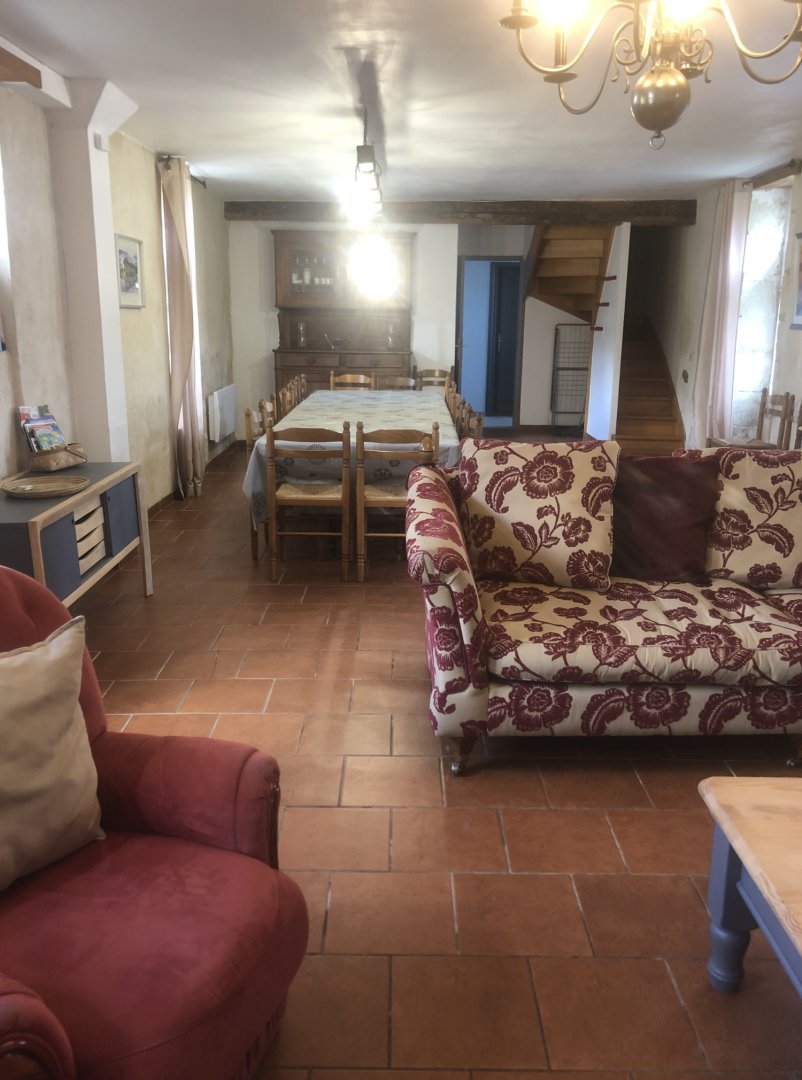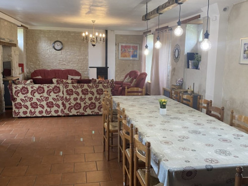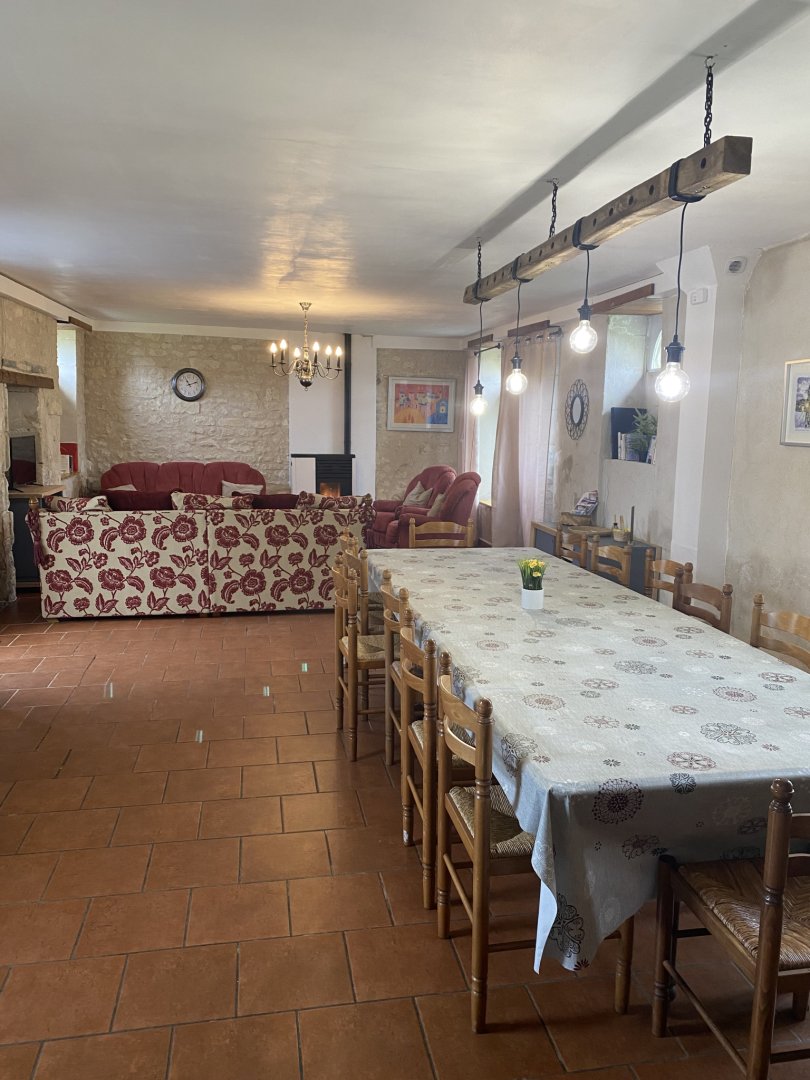 Un gîte très spacieux avec un grand espace de vie et une table à manger. Idéal à partager entre amis ou en famille.