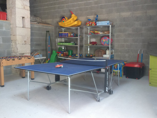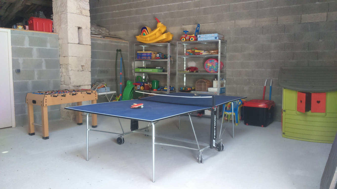 Salle de jeux couverte avec baby-foot, tennis de table, jeux de société et jeux pour le jardin.