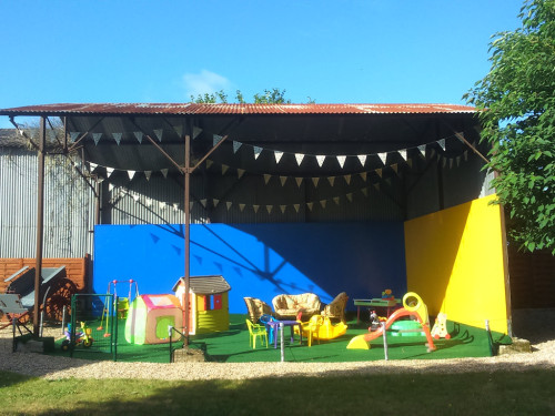 Nous avons également une grande aire de jeux (50 m²) couverte et sécurisée dans le jardin avec une tente à balles, une balançoire, un toboggan, un bureau de coloriage, bac à sable etc pour tout-petits.