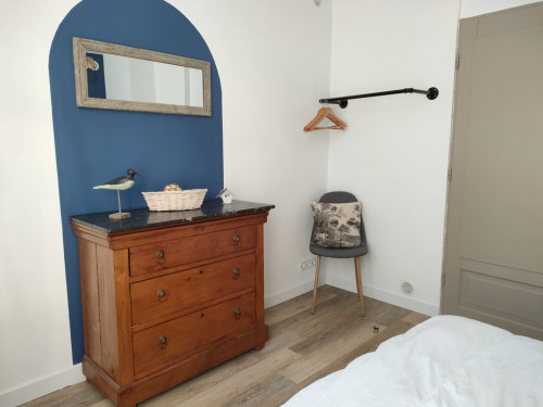 Une chambre de 11 m² avec un lit double (140x190), une commode et un coin penderie.