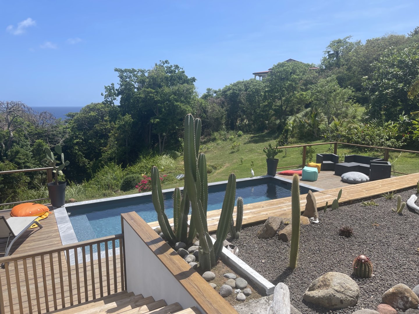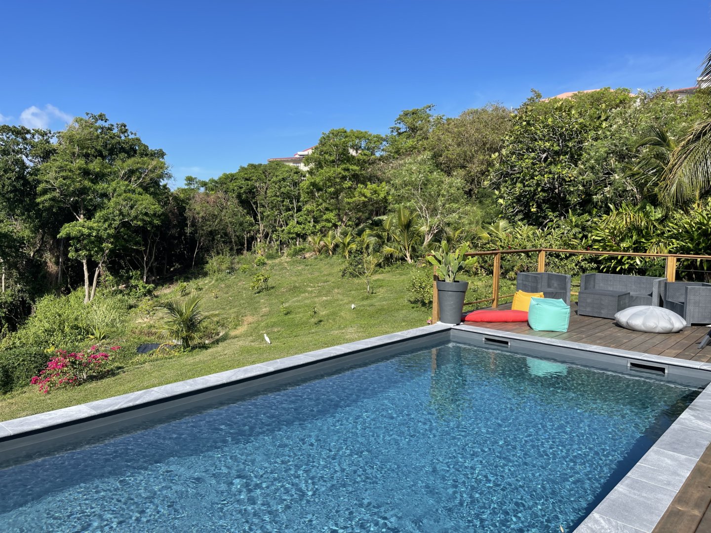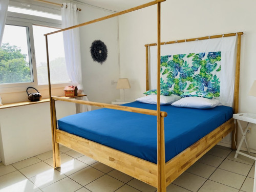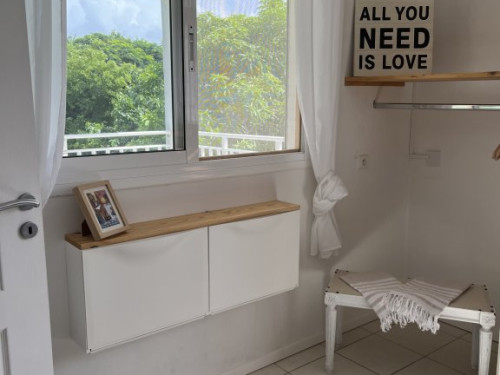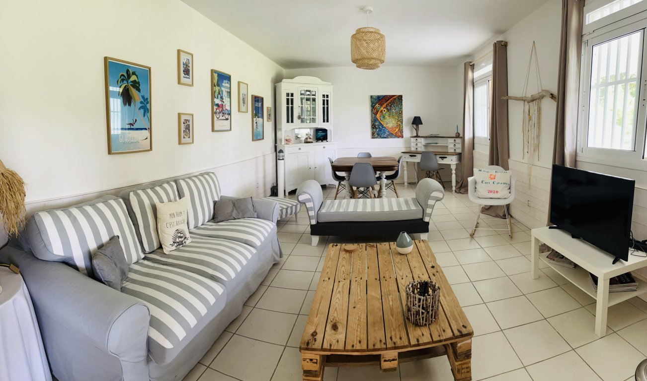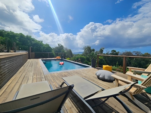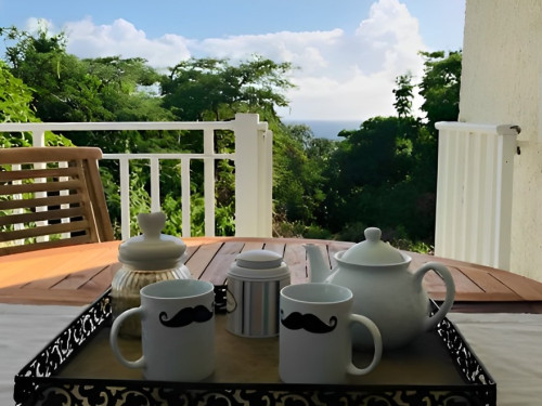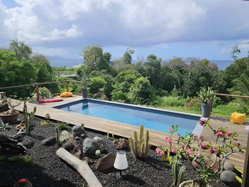 Idéalement situé le gîte Côté Caraïbes avec sa piscine au sel partagé avec les propriétaires, sa vue mer et sur les Saintes permet d’accueillir 4 à 6 personnes.