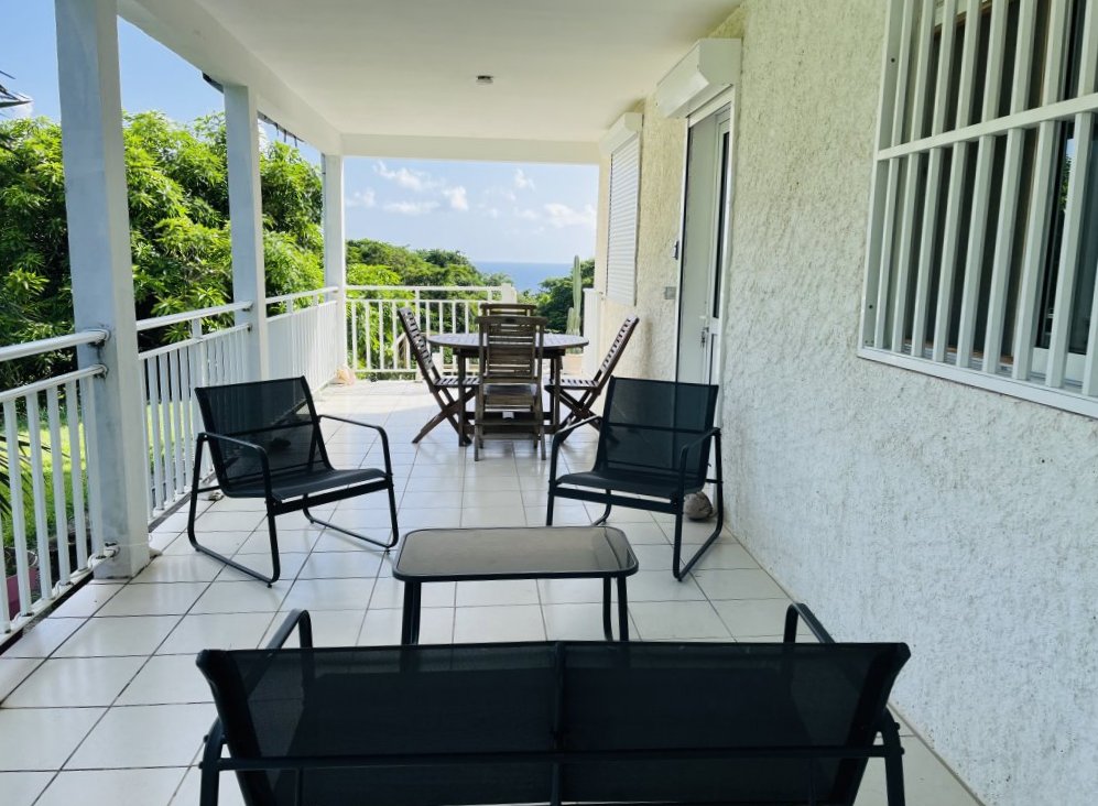 La terrasse couverte aménagée avec ensemble table, chaises, transats, salon extérieur vous permettra de vous détendre face à la mer.