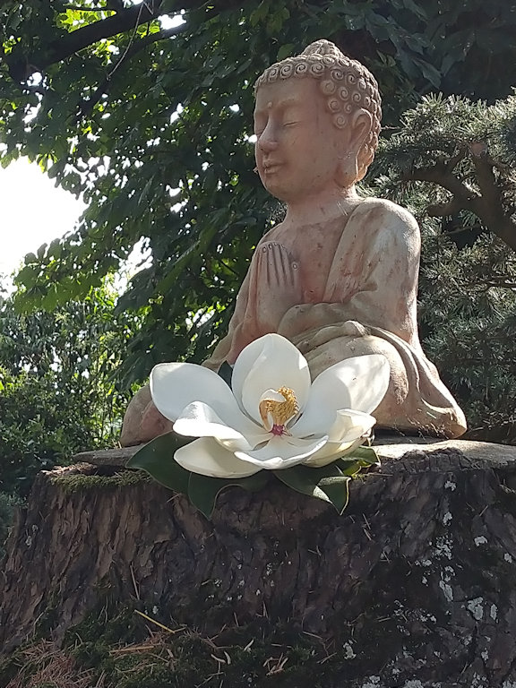 Il est possible de se restaurer au jardin où nous installons table et chaises aux beaux jours, à l'ombre du magnolia.