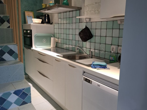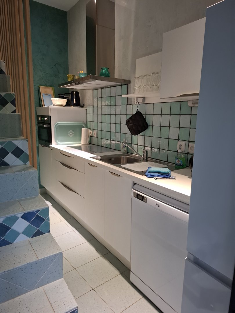 Au rez-de-chaussée : une cuisine équipée, un salon avec un canapé-lit doté d'un vrai matelas.