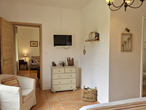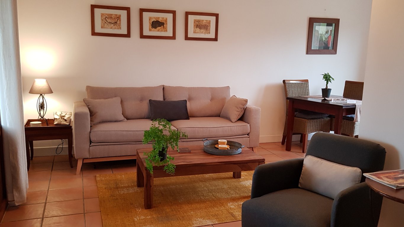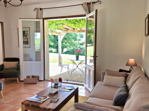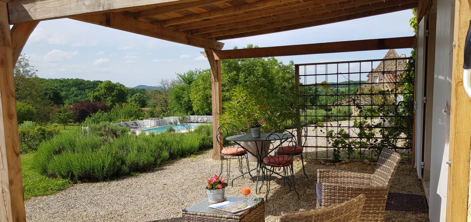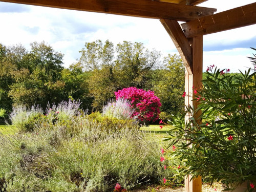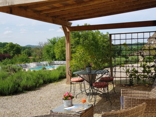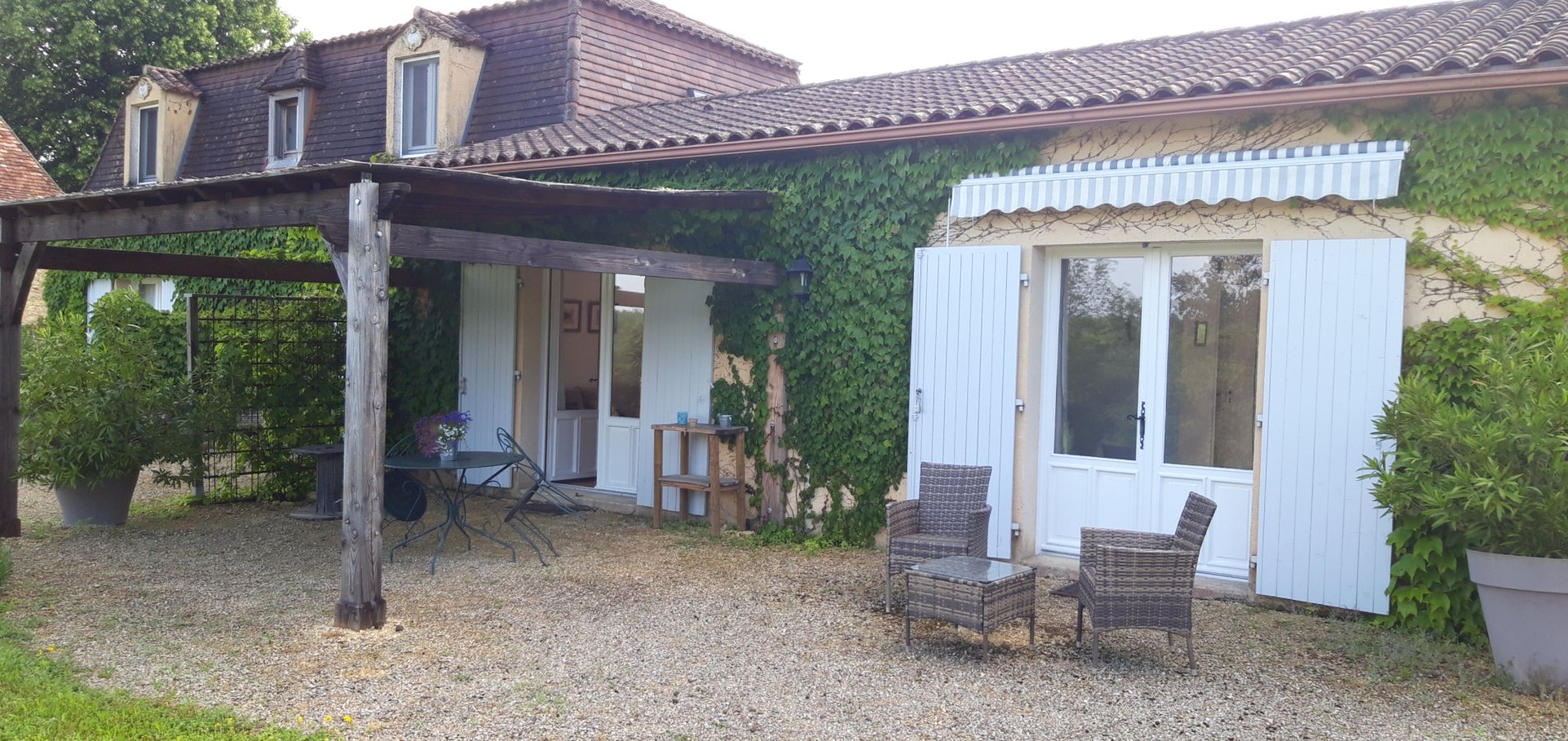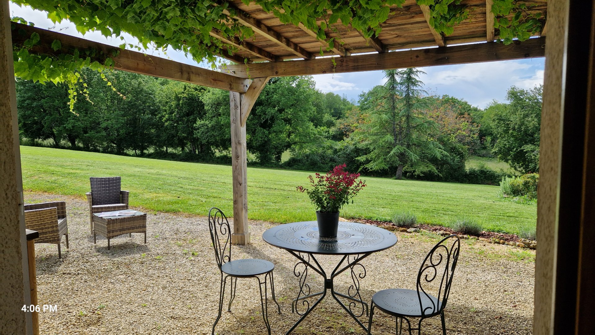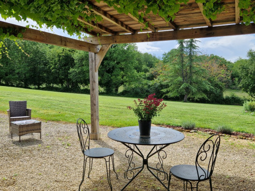 Ce gîte "Cussac", pour 2 personnes, vous séduira par son espace, sa luminosité et son grand confort. Il se trouve de plain-pied et est ouvert sur nos 2 hectares de parc avec vue sur la piscine. Il bénéficie d'une belle pergola de 18 m² aménagée avec salon de jardin, tables, chaises et d'une vaste terrasse privative.