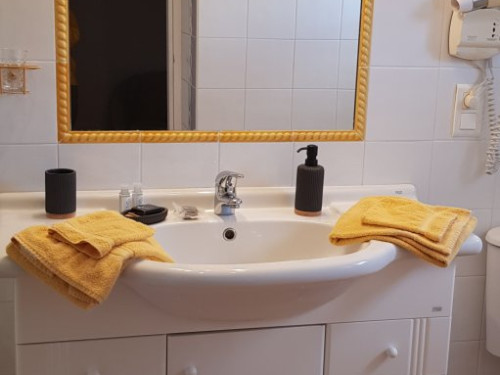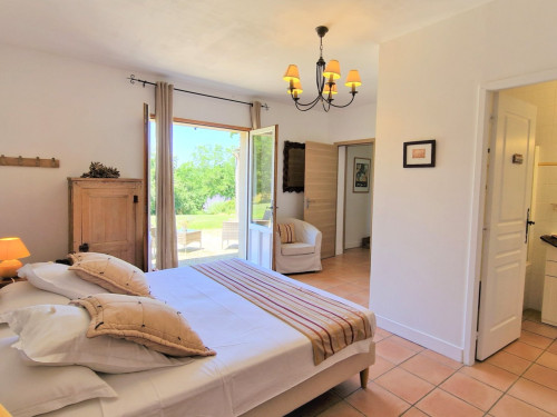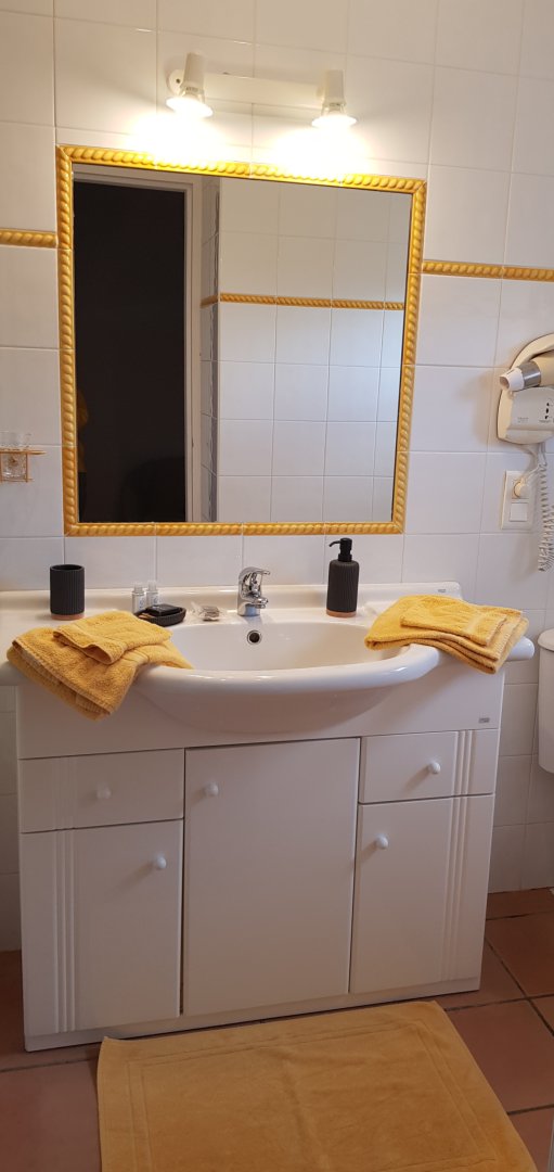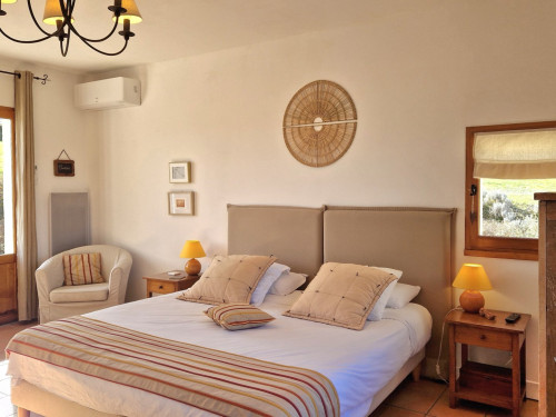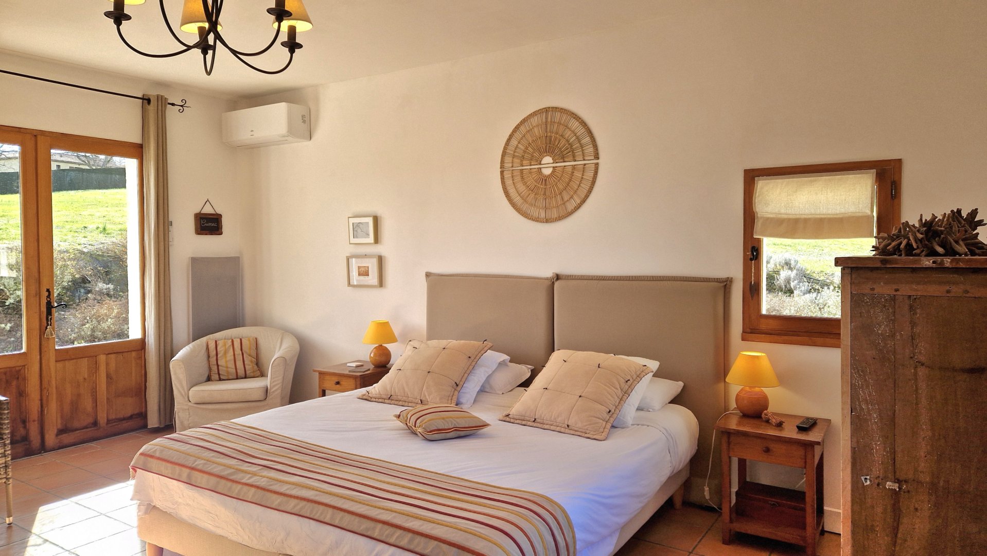 La chambre climatisée, elle aussi de 25 m², est pourvue d’une grande literie (180x200) ou à la demande de lits jumeaux. Elle dispose d’une salle de bain avec baignoire, plan vasque et des toilettes.