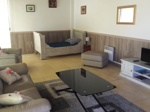 - Une salle à manger-salon : canapé, fauteuil, télévision.