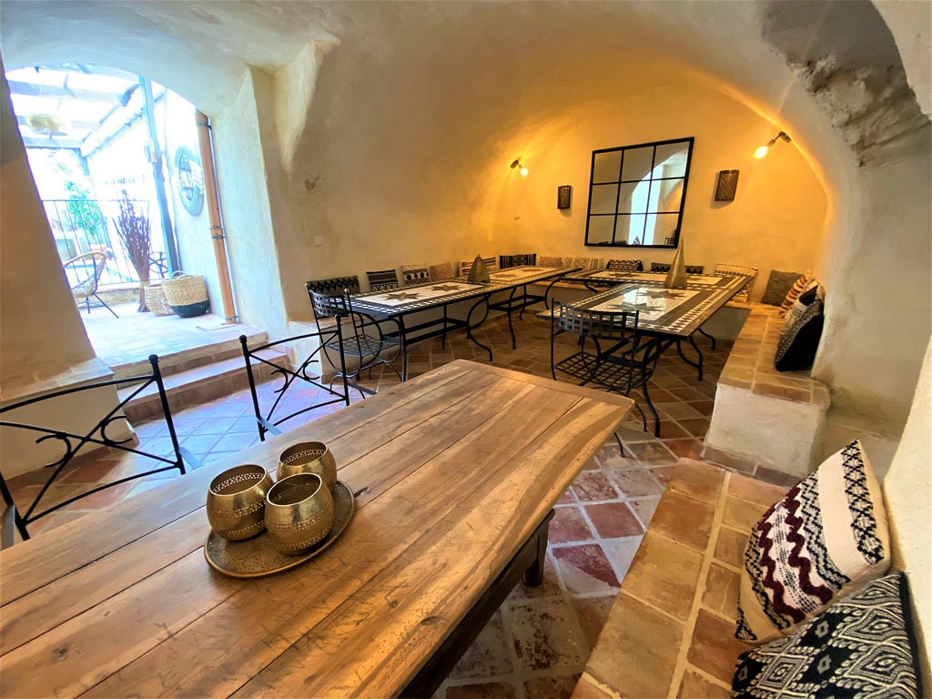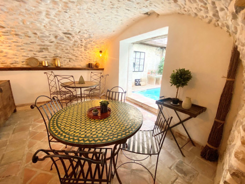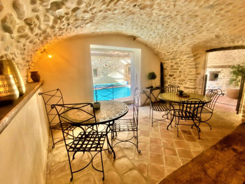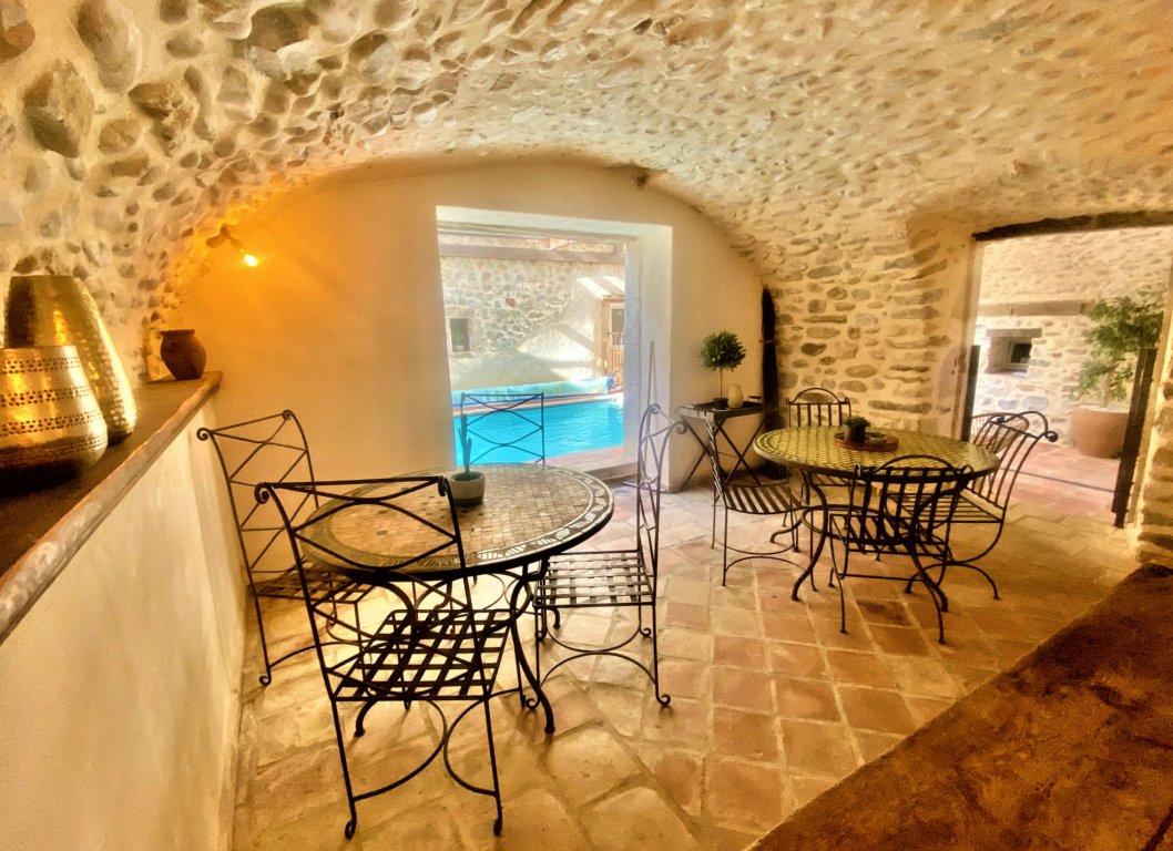 - Tout autour, s’articulent deux BELLES SALLES intérieures aux voutes de pierres, ouvertes sur la cour intérieure couverte et la piscine.