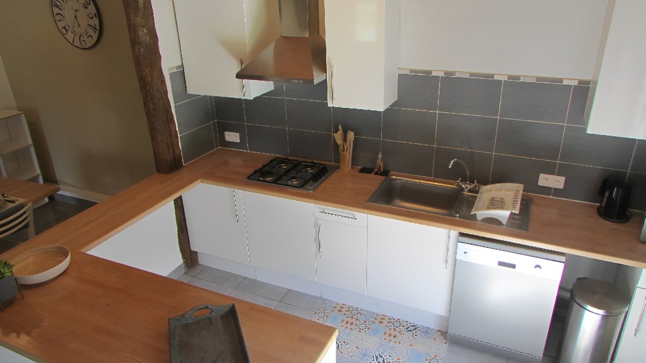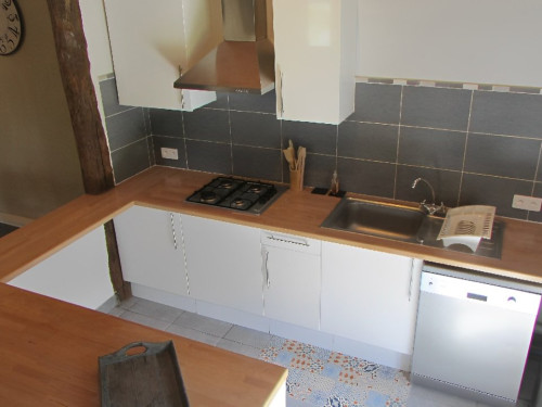 Cuisine entièrement équipée : four micro-ondes, plaque de cuisson, réfrigérateur bas, lave-vaisselle, cafetière, bouilloire, grille-pain, vaisselle, rangements...
