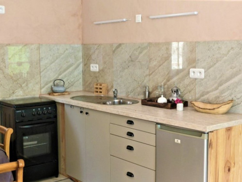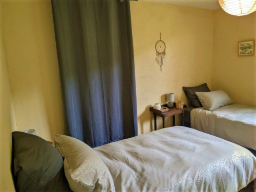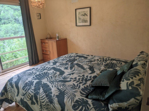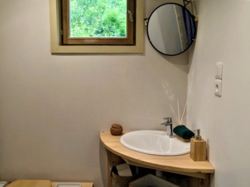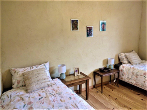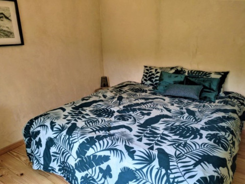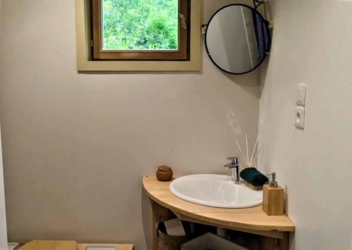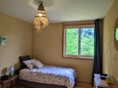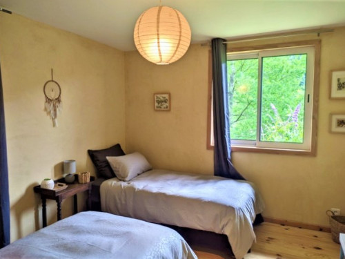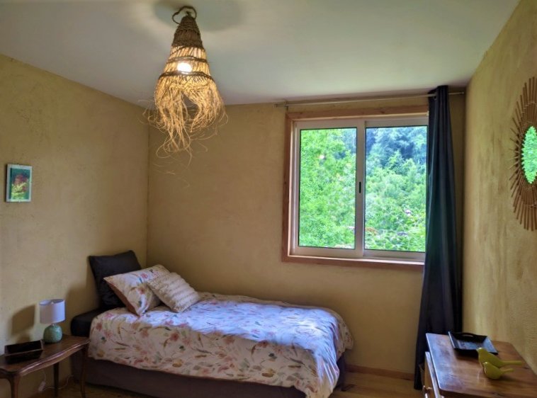 Gîte en bois indépendant sur pilotis situé dans l'Ecolieu Source Nature du Mas d'Azil au cœur de 50 hectares de nature. Une terrasse de 30 m² avec table de jardin, chaises et bains de soleil, plancha. Séjour (insert à bois) avec coin cuisine. 3 chambres avec chacune 2 lits 90 x 190 cm jumelables en 1 lit en 190 cm. 2 salles d'eau avec chacune douche, vasques, toilettes sèches. local de rangement (vélos...). Chauffage au bois. Draps, linge de toilette, linge de maison, service ménage Gîte avec charges incluses (électricité) l'été. L'hiver, seul le bois est en supplément (70 €/stère). Gîte non adapté aux enfants (mares à proximité).