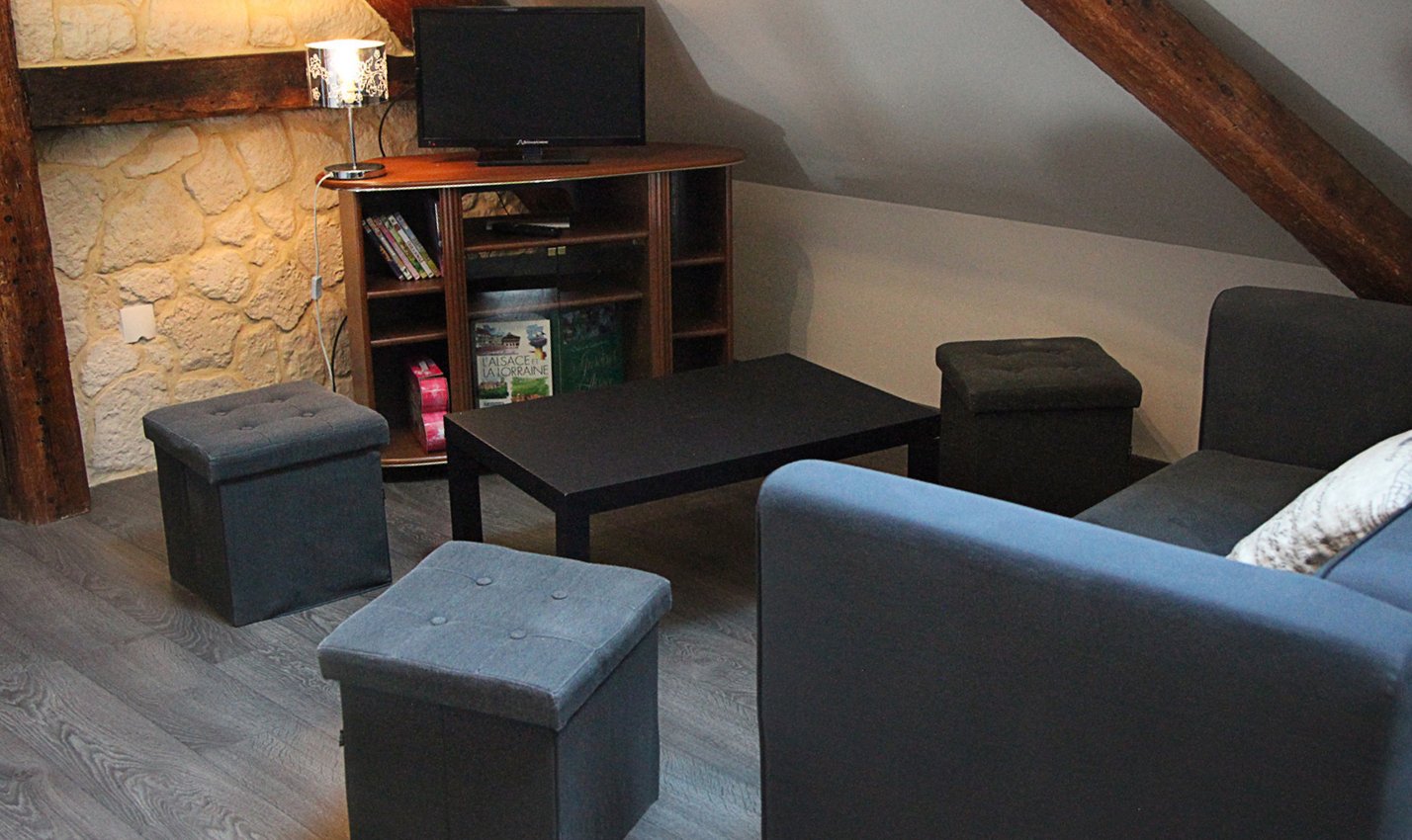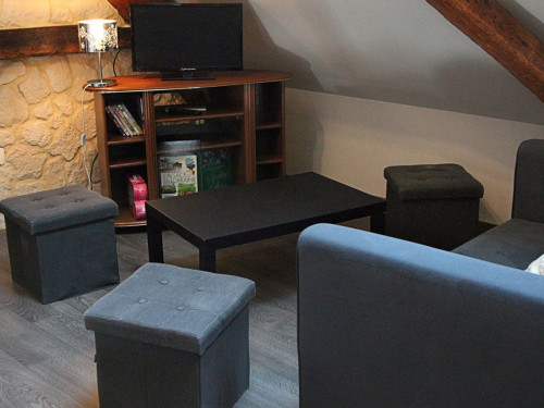 - un espace ouvert de 30 m² équipé d'un coin salon (TV et lecteur DVD), d'un canapé convertible
