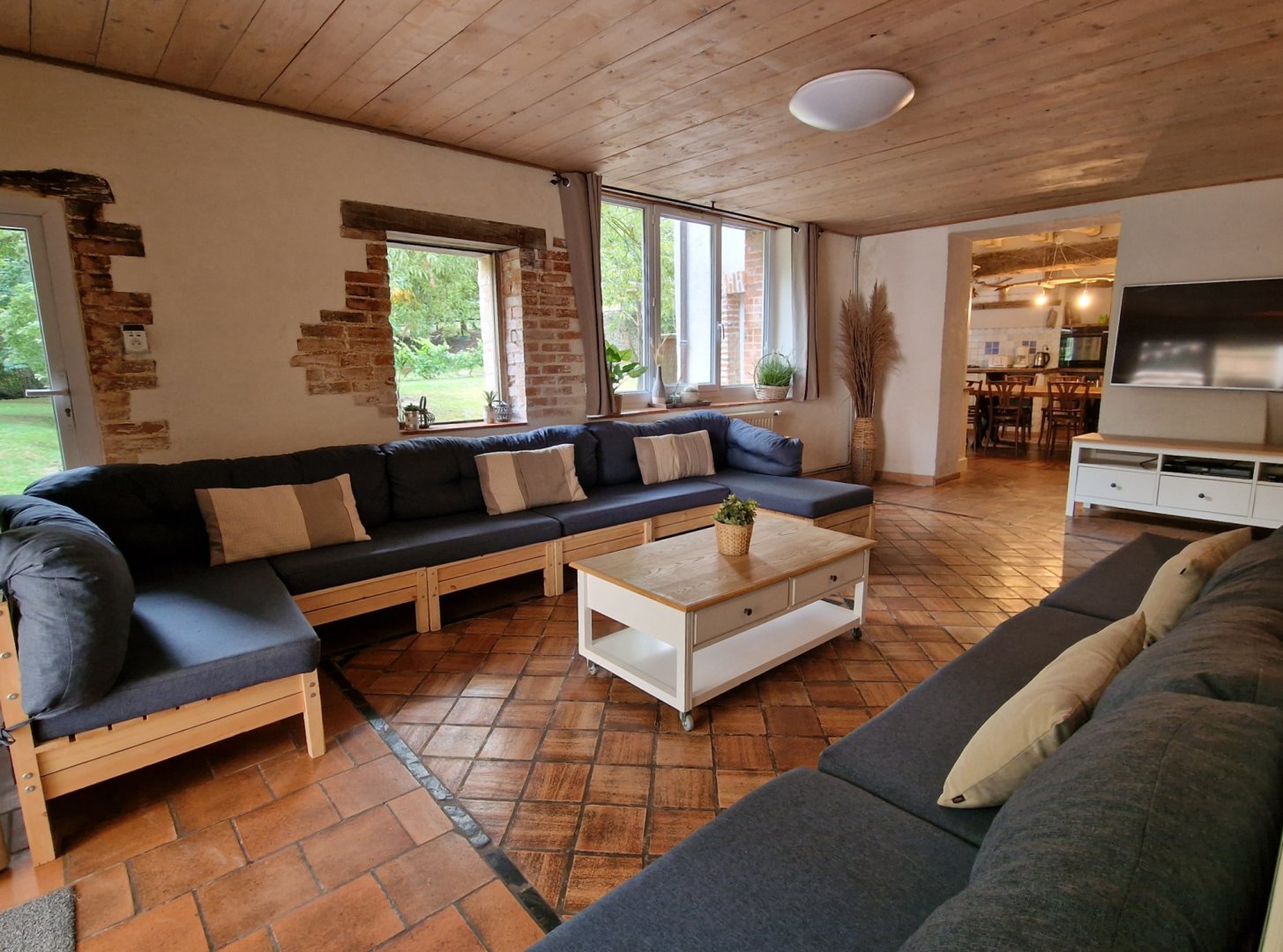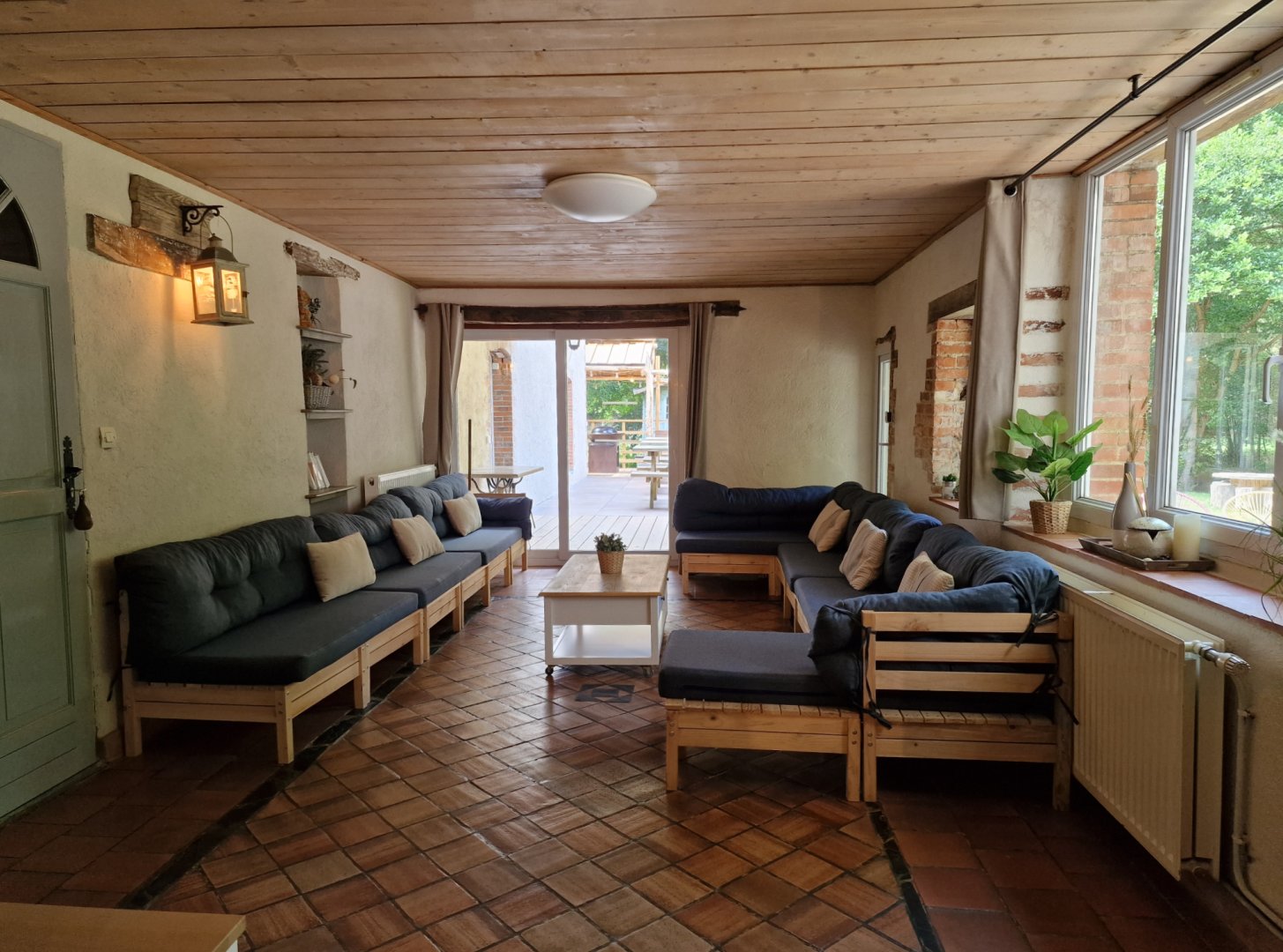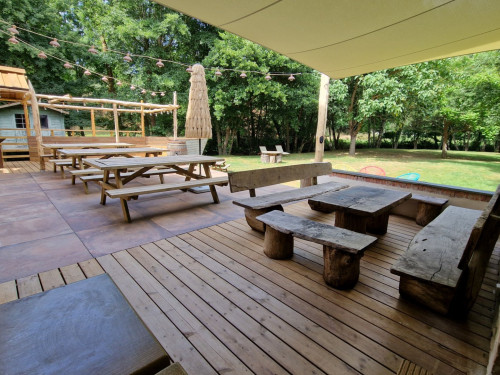• à l'extérieur : au-delà de la terrasse ; un grand jardin pour profiter et vous détendre avec le doux bruit de l'eau de l'Hyrôme qui s'écoule à la sortie du Moulin.