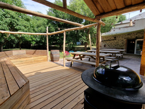 • en son rez-de-chaussée : un salon avec téléviseur qui se poursuit sur le jardin où vous pourrez également prendre vos repas sur une terrasse aménagée avec tables, salon et barbecue, une grande cuisine conviviale, 1 chambre pour 3 personnes avec sa salle d'eau privative, 1 WC.