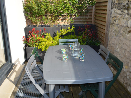 Extérieur cour : salon de jardin (canapé, fauteuils, table basse)