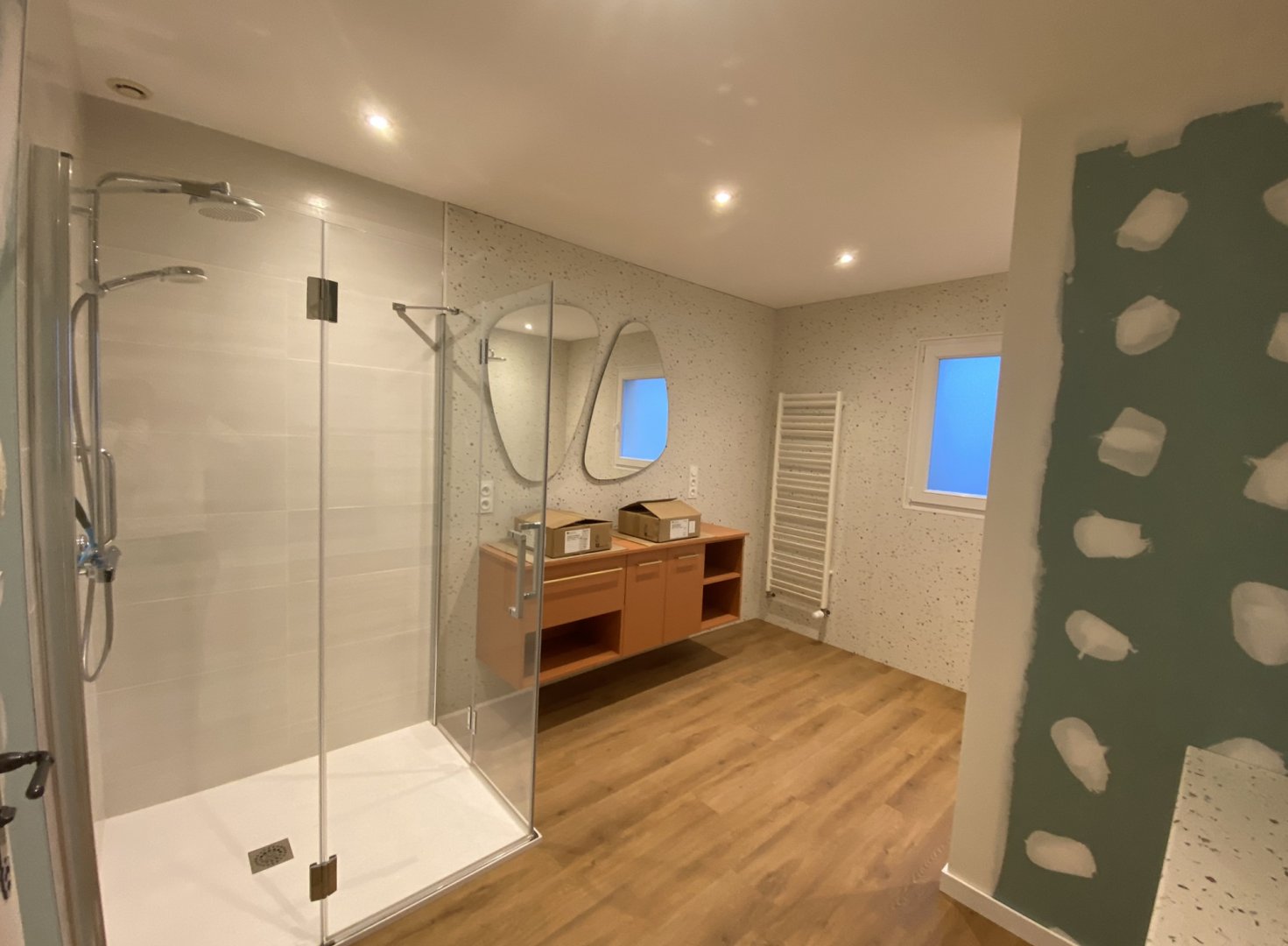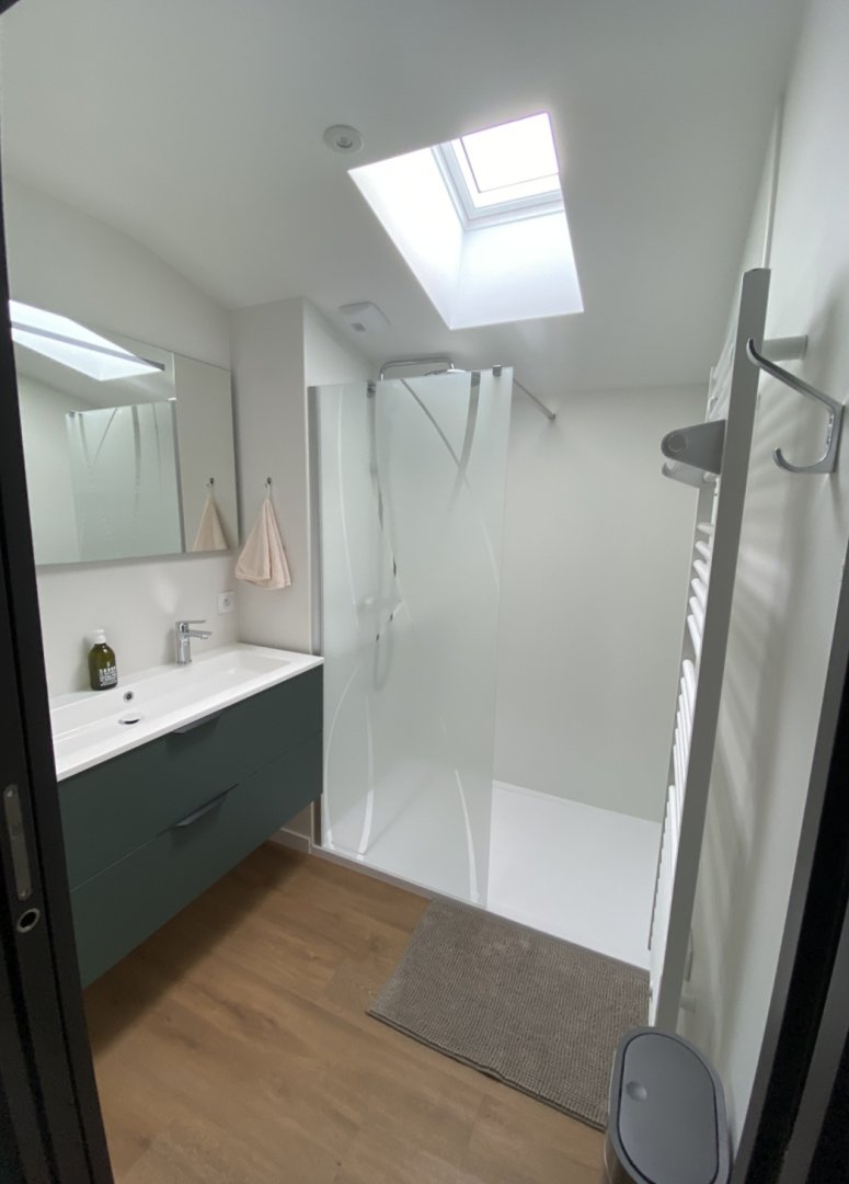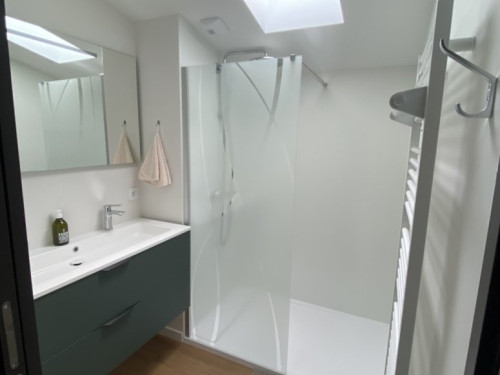 A l’étage à gauche se situent 2 chambres + 1 douche + 1 WC séparé. Il y a dans chaque chambre une vasque avec miroir.