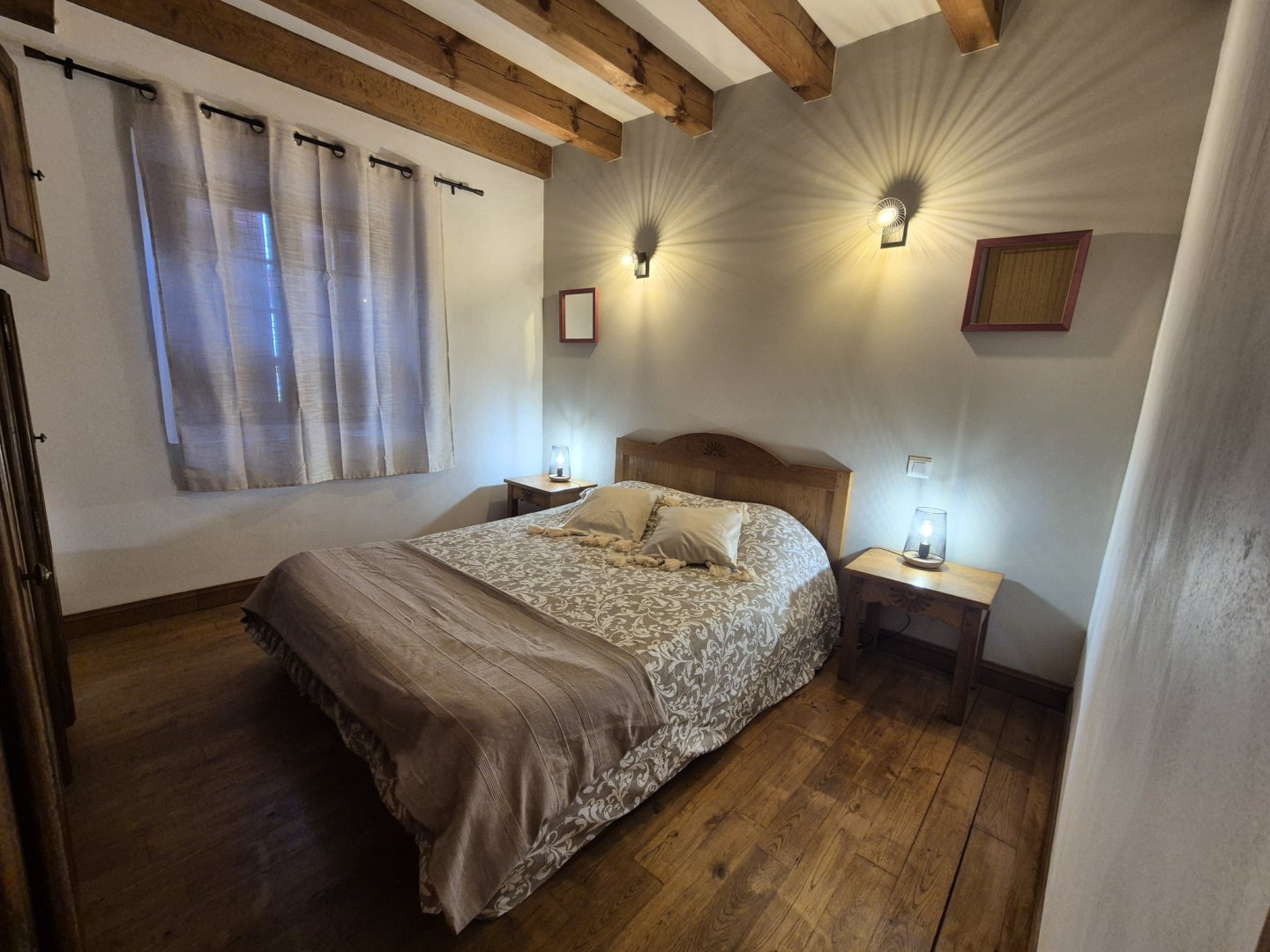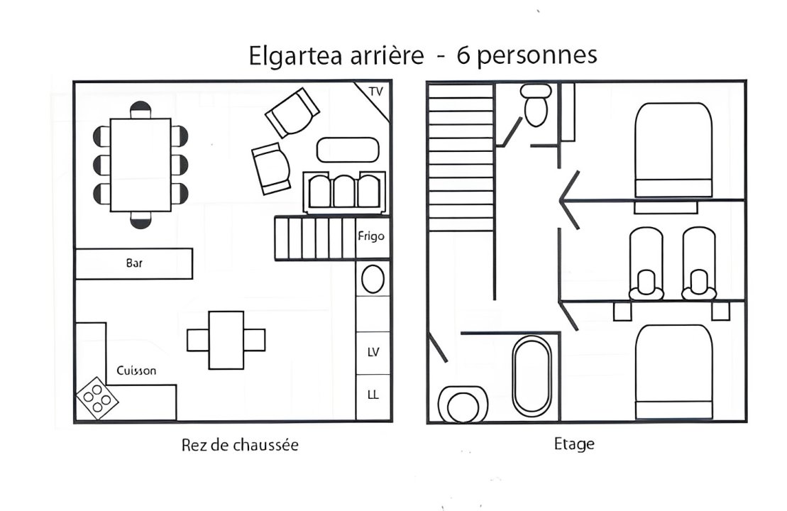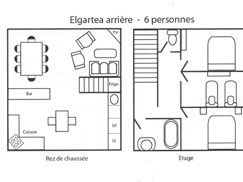 Étage : 2 chambres (1 lit en 140), 1 chambre (2 lits en 90 cm), 1 WC, 1 salle de bain.