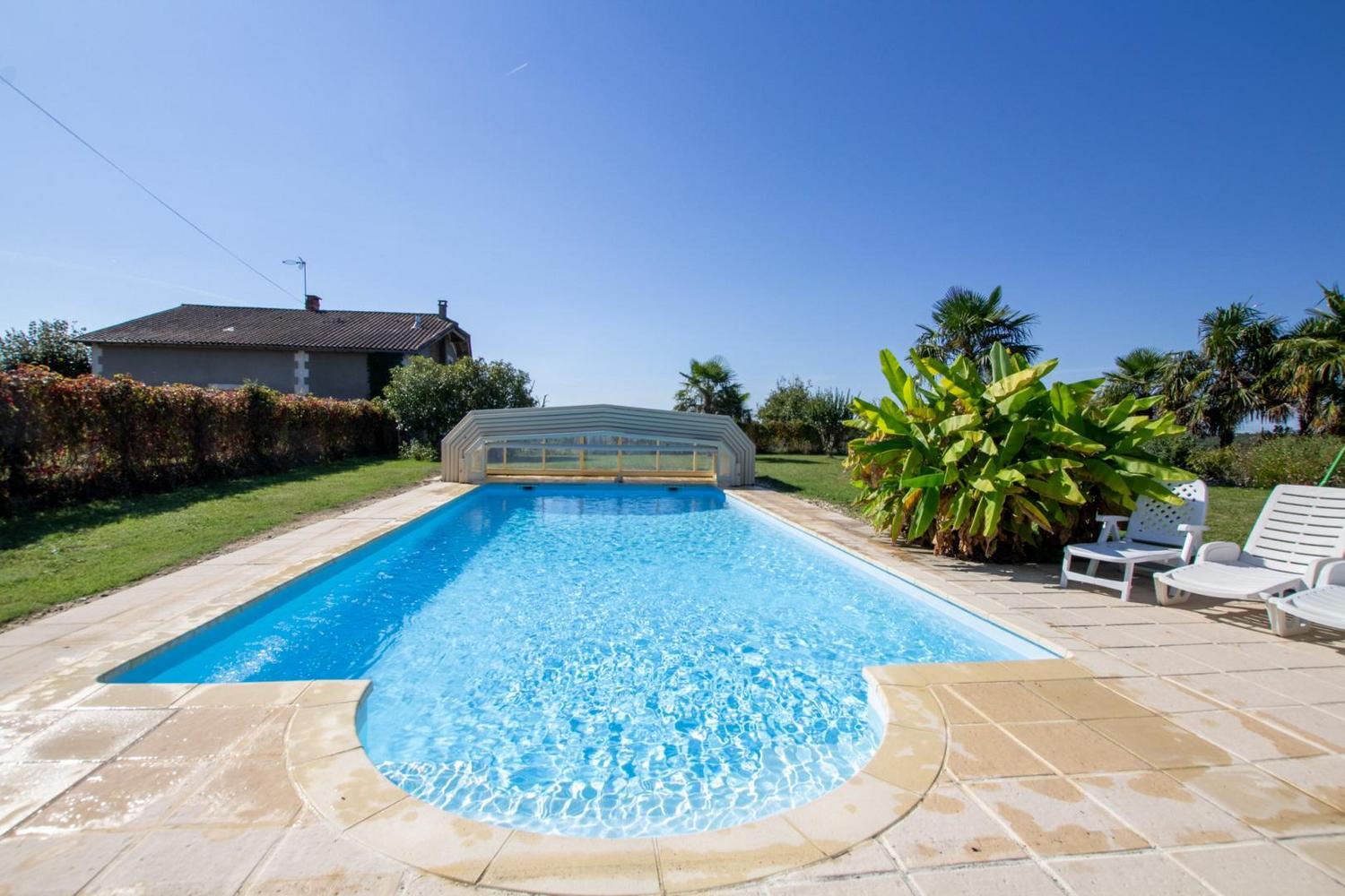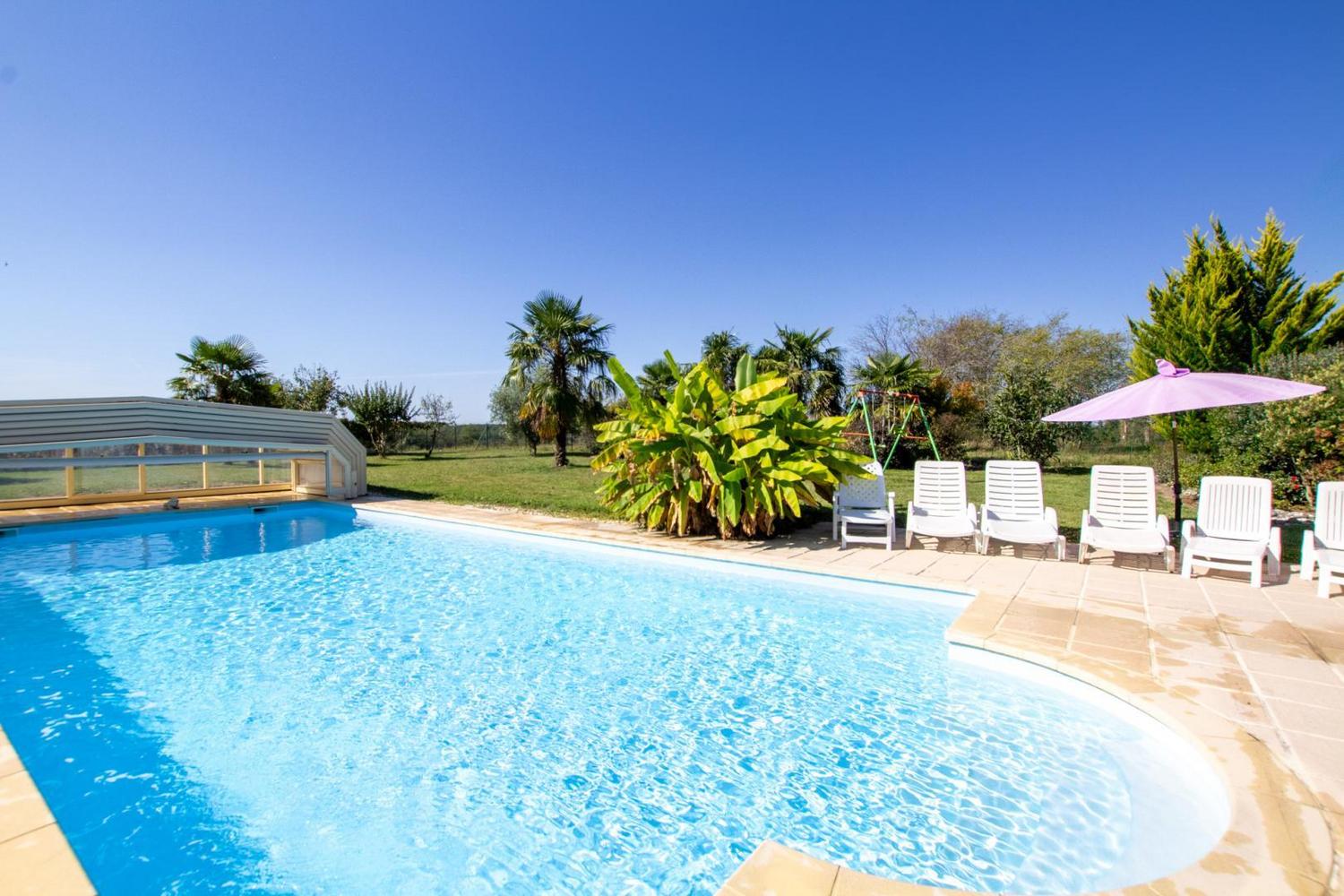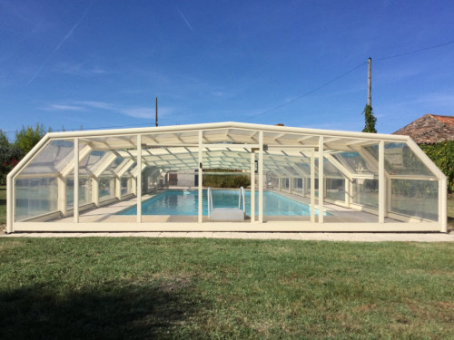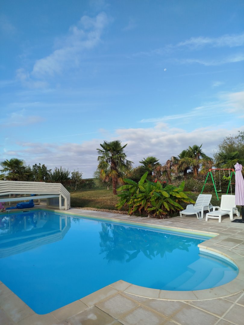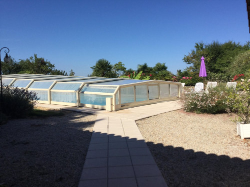 Maison indépendante avec une piscine au sel privative entrée par un escalier roman de dimensions 12 x 6 m profondeur 40 cm jusqu'à 180 cm progressif ouverte de mai à fin septembre sécurisée par dôme (piscine non chauffée).