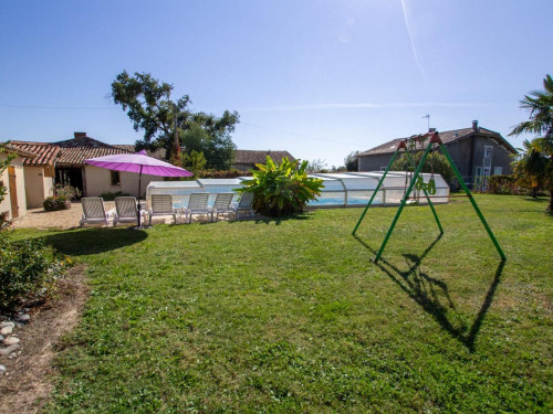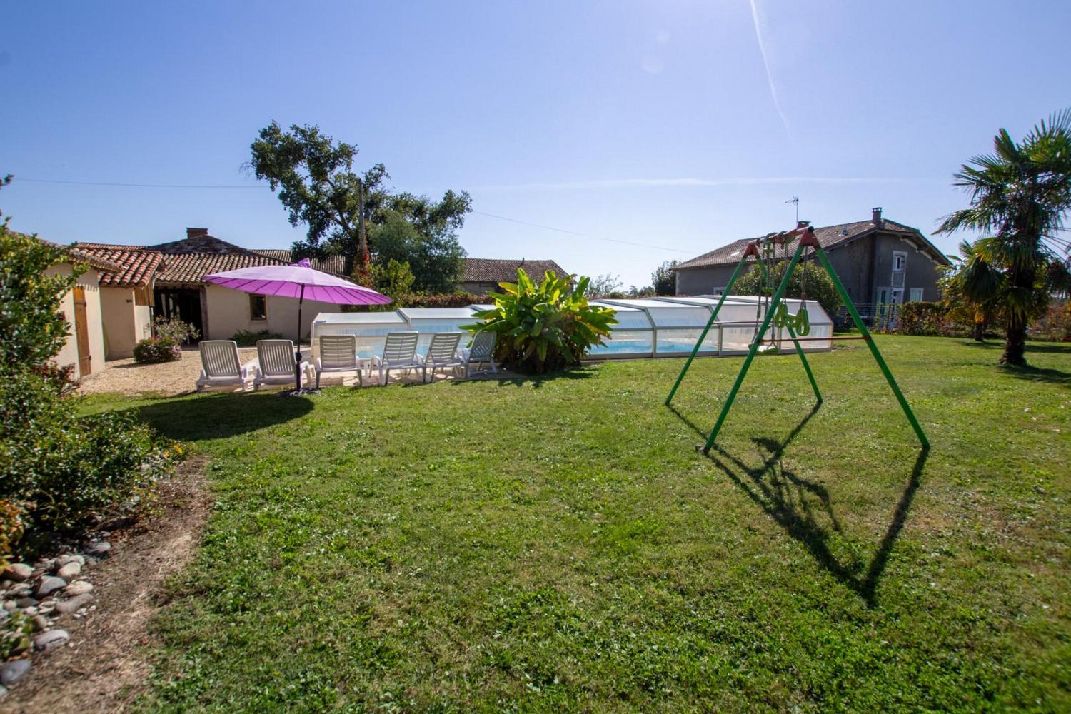 Terrasse au sud devant le gîte et devant la piscine avec barbecue. Balançoire.