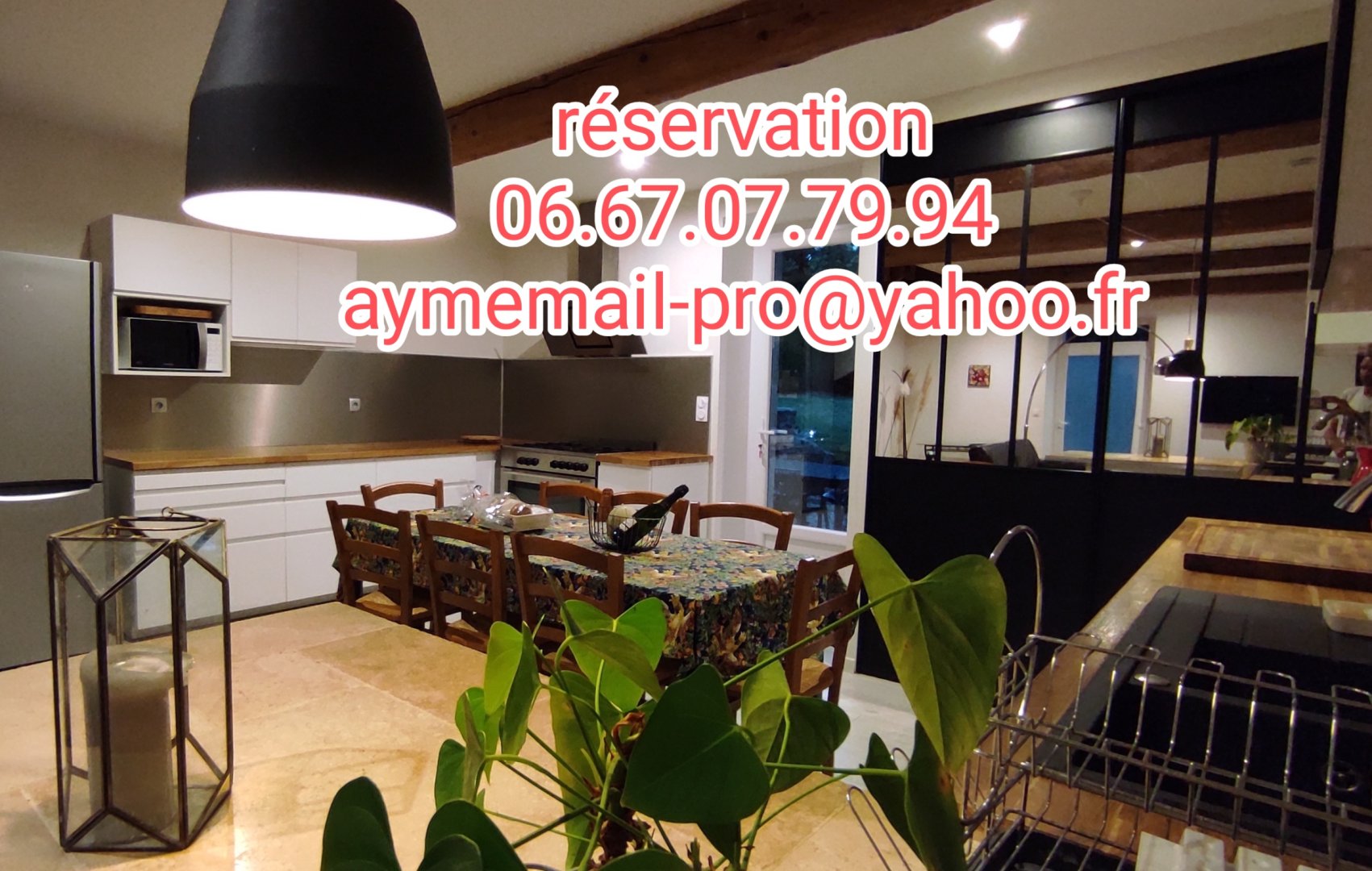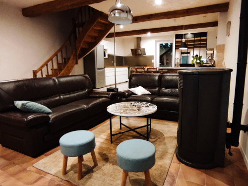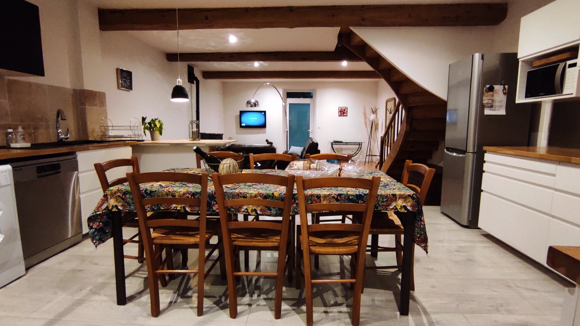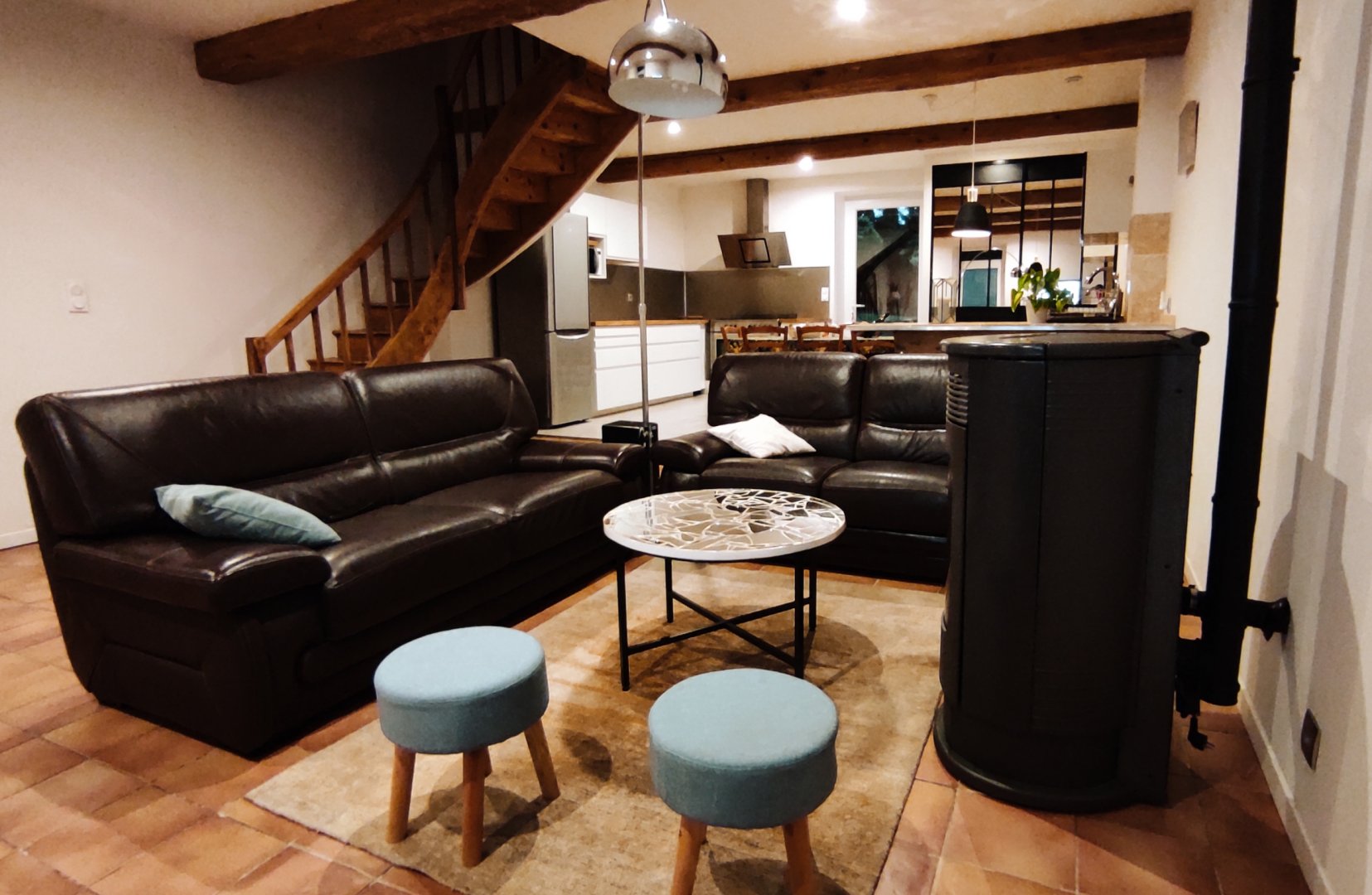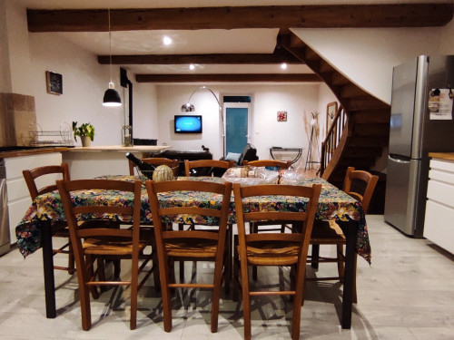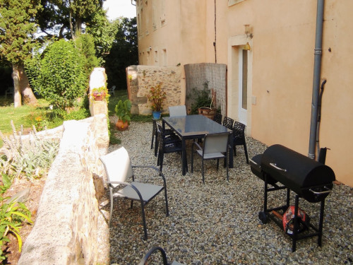 Gîte comprenant au rez-de-chaussée : un grand séjour et cuisine (toute équipée), donnant sur la terrasse avec salon de jardin et barbecue.