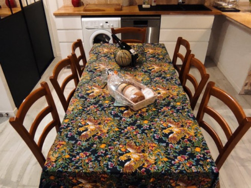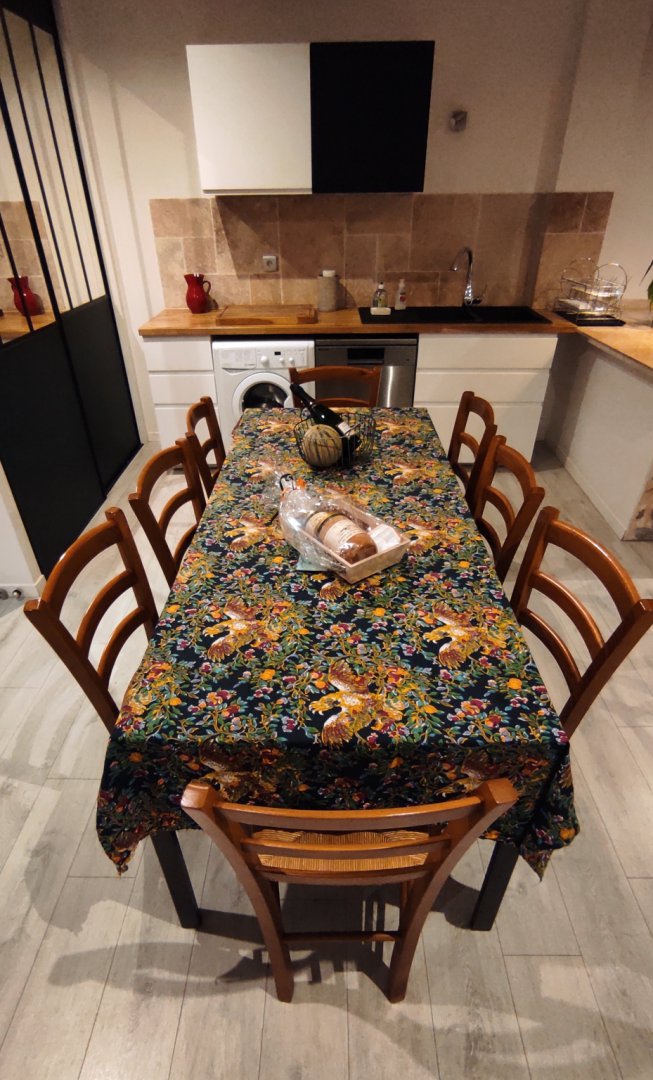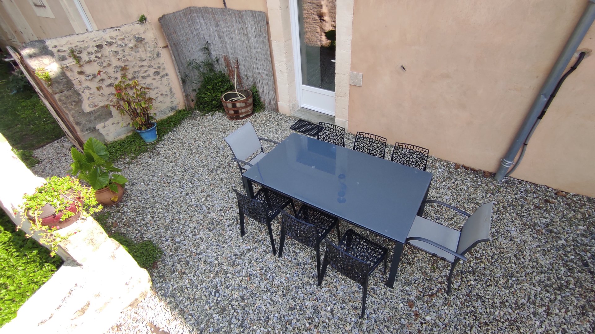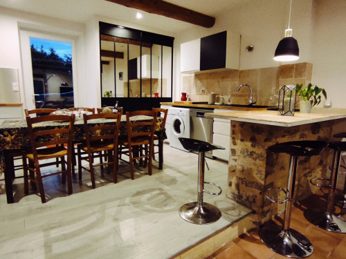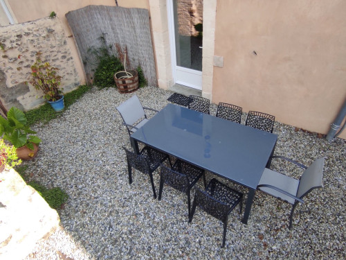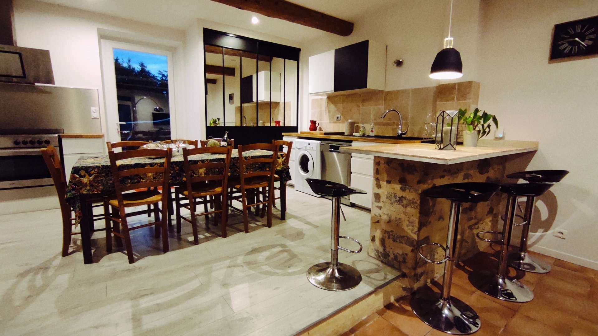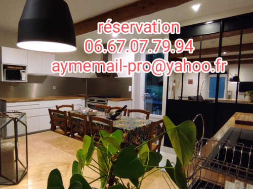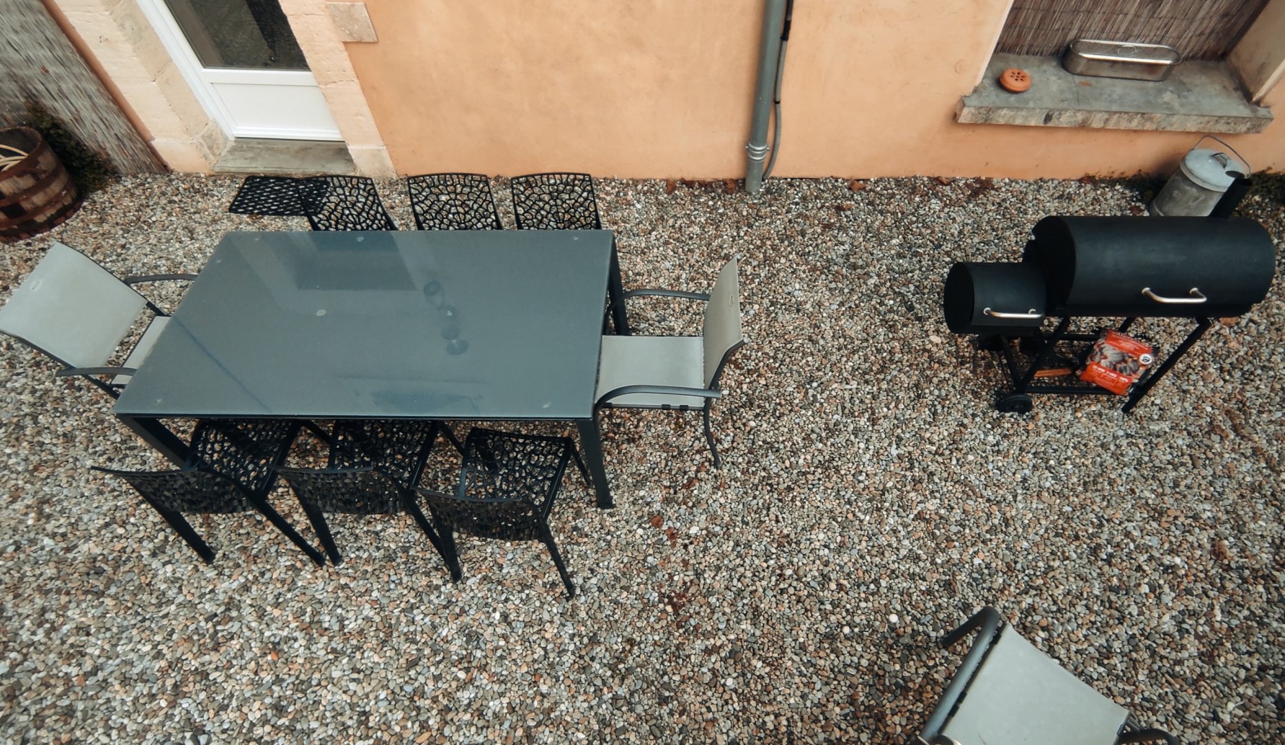 Gîte comprenant au rez-de-chaussée : un grand séjour et cuisine (toute équipée), donnant sur la terrasse avec salon de jardin et barbecue.