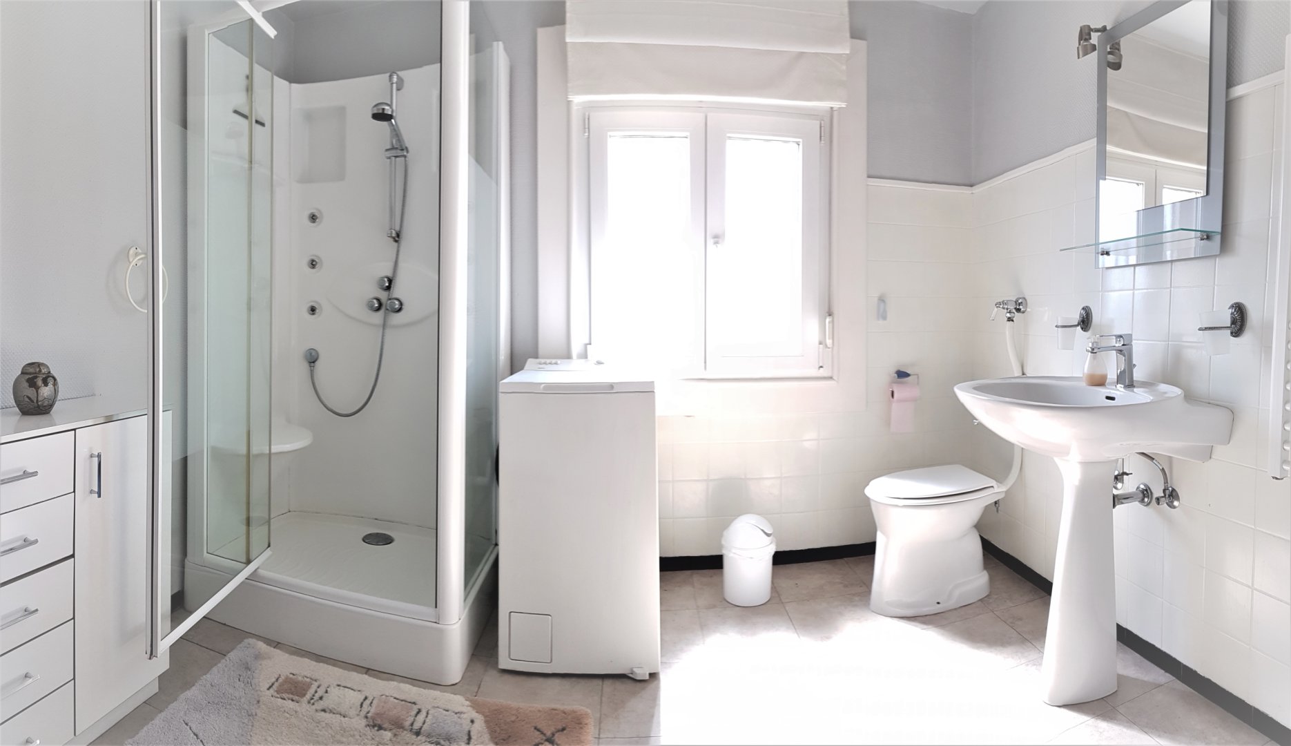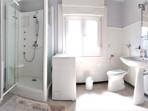 1 salle de bain avec douche toilette et lave-linge