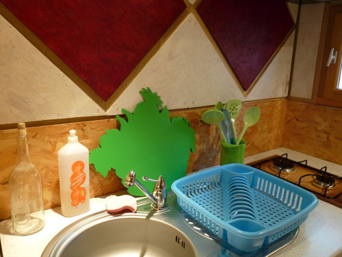 Kitchenette bien équipée (micro-ondes, duo gaz, évier, réfrigérateur top, ustensiles cuisine de base, vaisselle pour 2 à 4 personnes nécessaire pour les petits déjeuners).