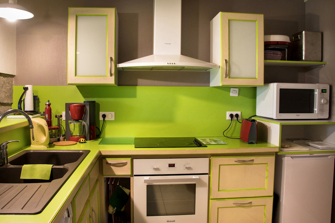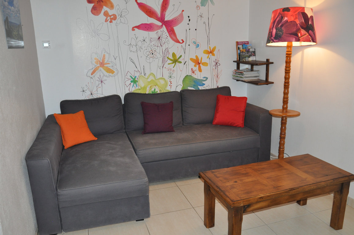 Au RDJ : grande pièce commune ouvrant sur une terrasse avec cuisine américaine bien équipée, un salon attenant (avec couchage d’appoint), une salle d’eau et un WC indépendant.