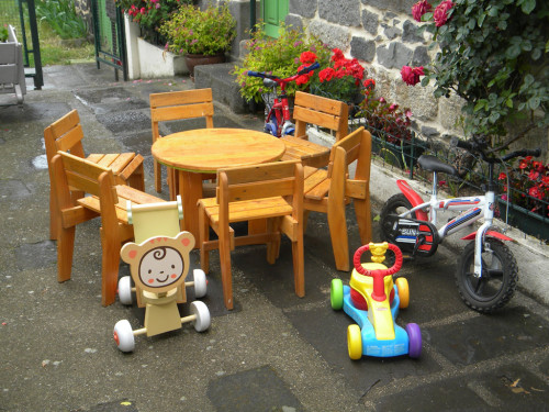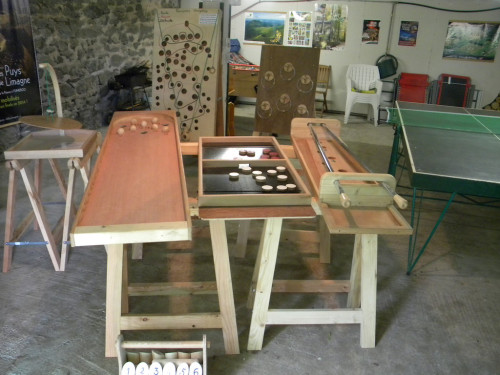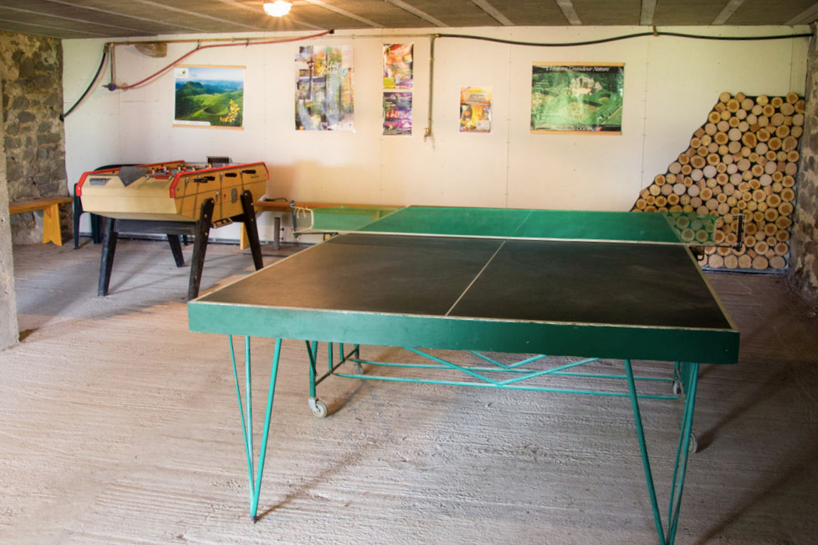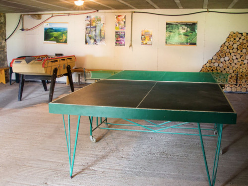 Salle de jeux (tennis de table, baby foot et nombreux jeux en bois) trottinettes, draisiennes et vélos pour enfants.