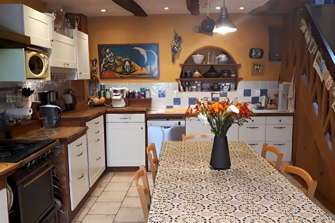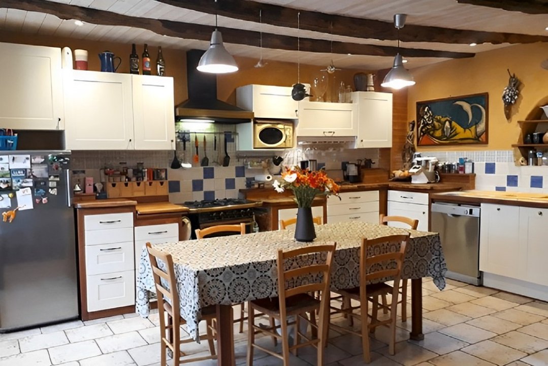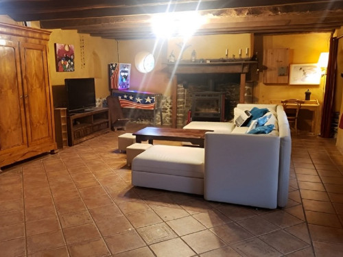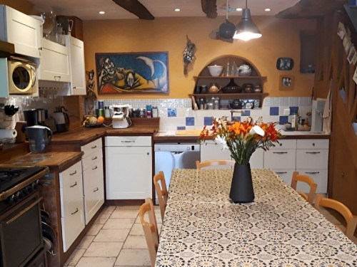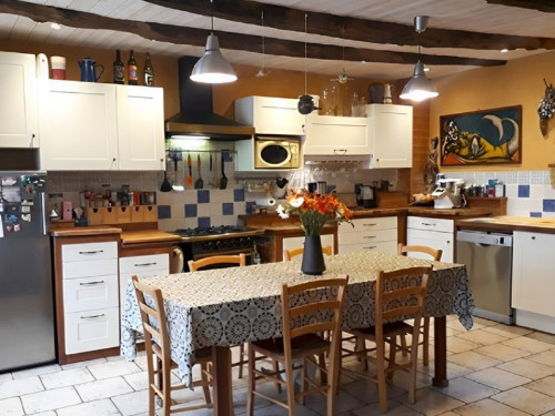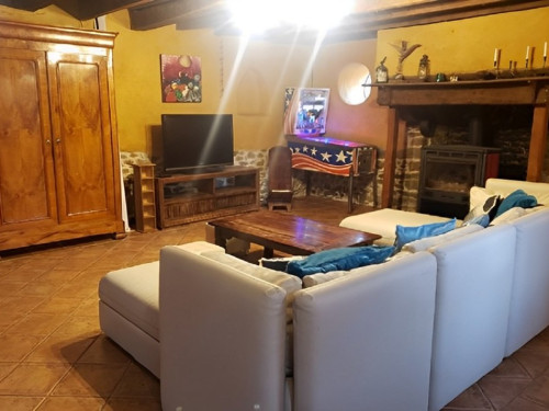 • au rez-de-chaussée, vous trouverez une cuisine tout équipée avec une grande table de 2.80 m de long et un grand salon, le tout composant une grande pièce à vivre de 65 m², ainsi qu'1ère chambre avec 2 lits simples électriques, une salle d'eau et un WC