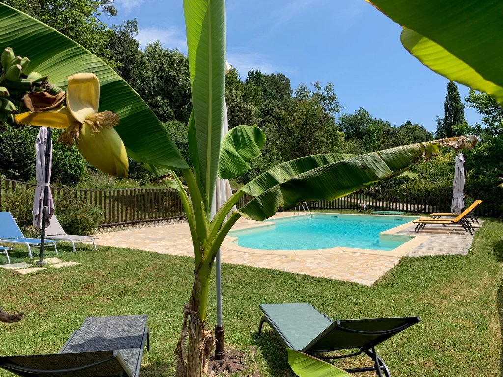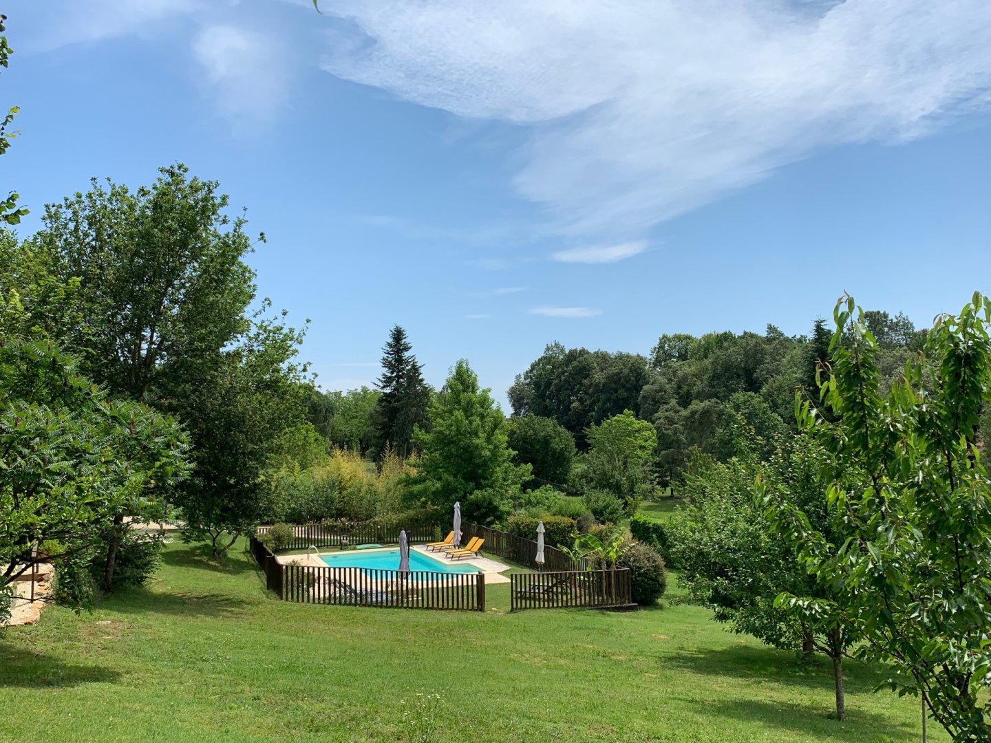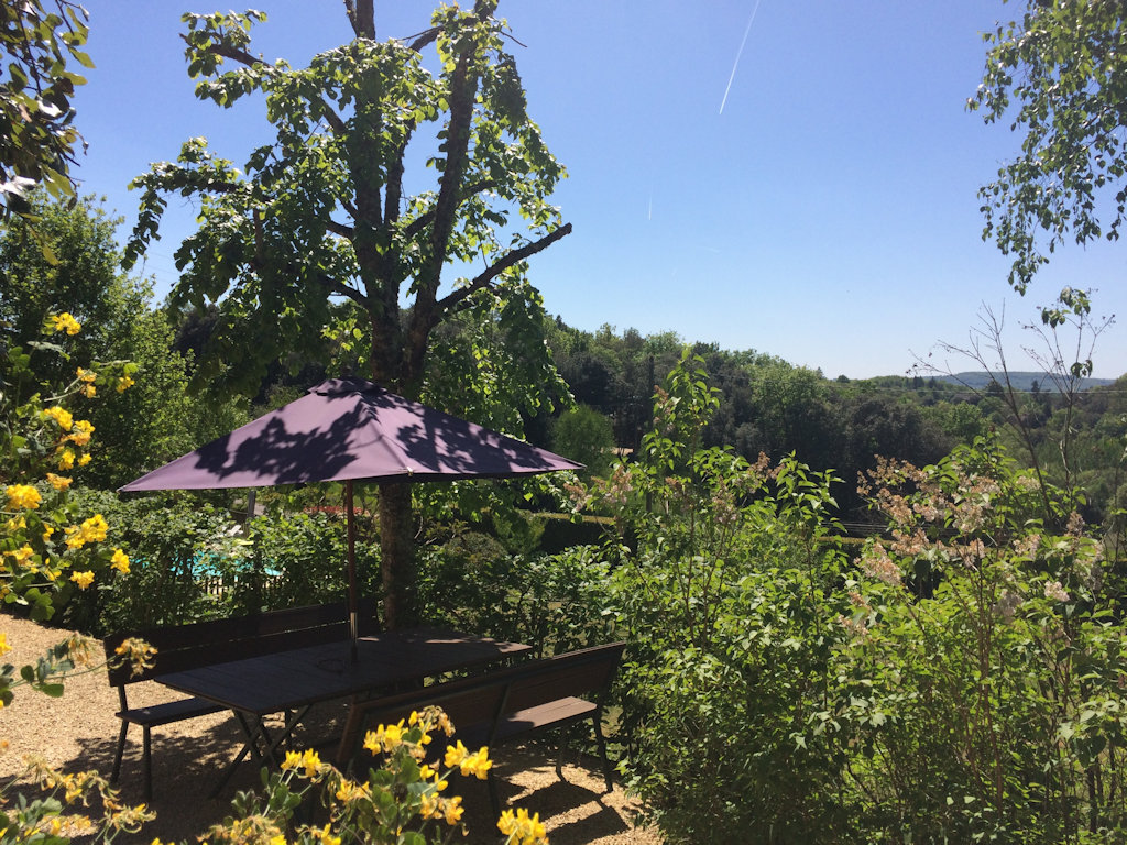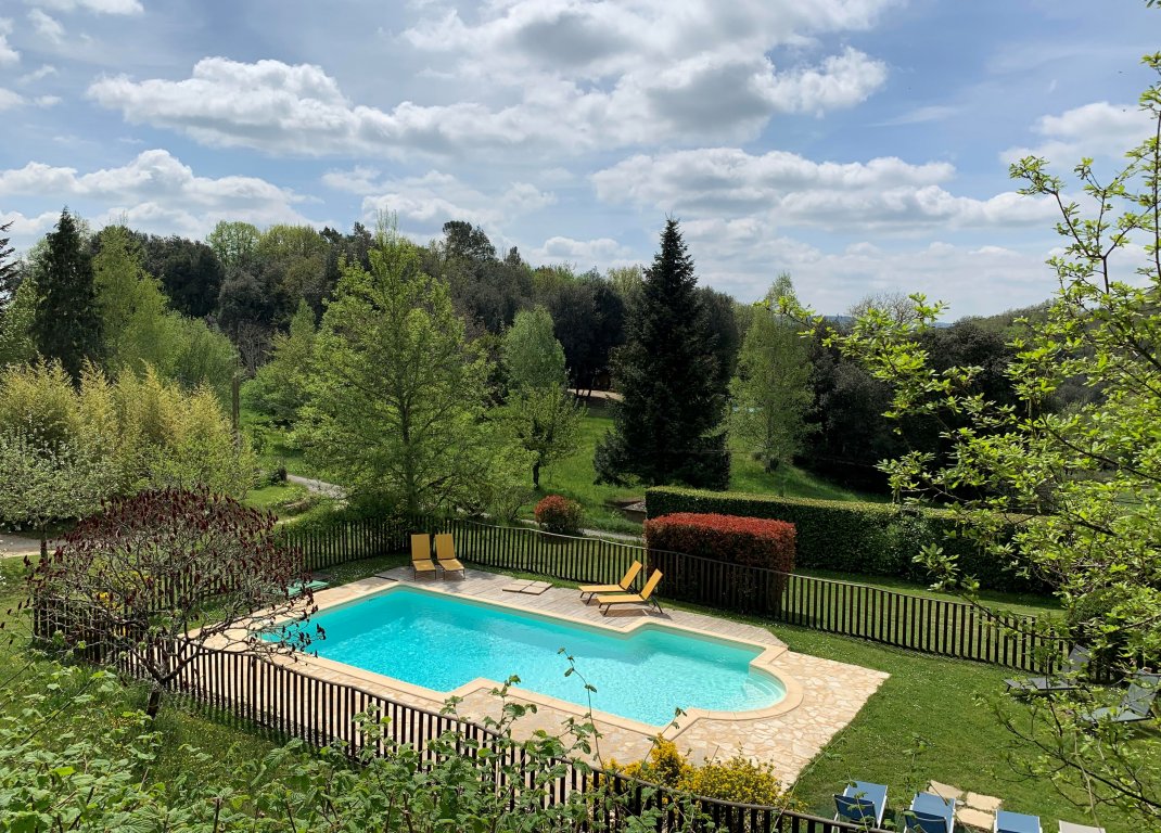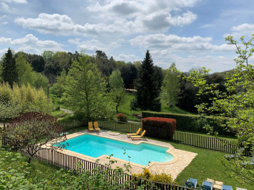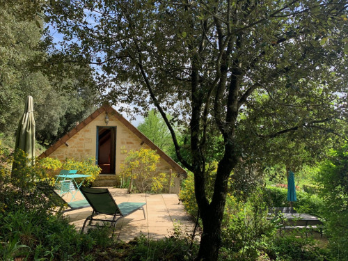 Gîtes de charme avec terrasse dans un domaine boisé au bord de la piscine, situés à 10 km de Sarlat.