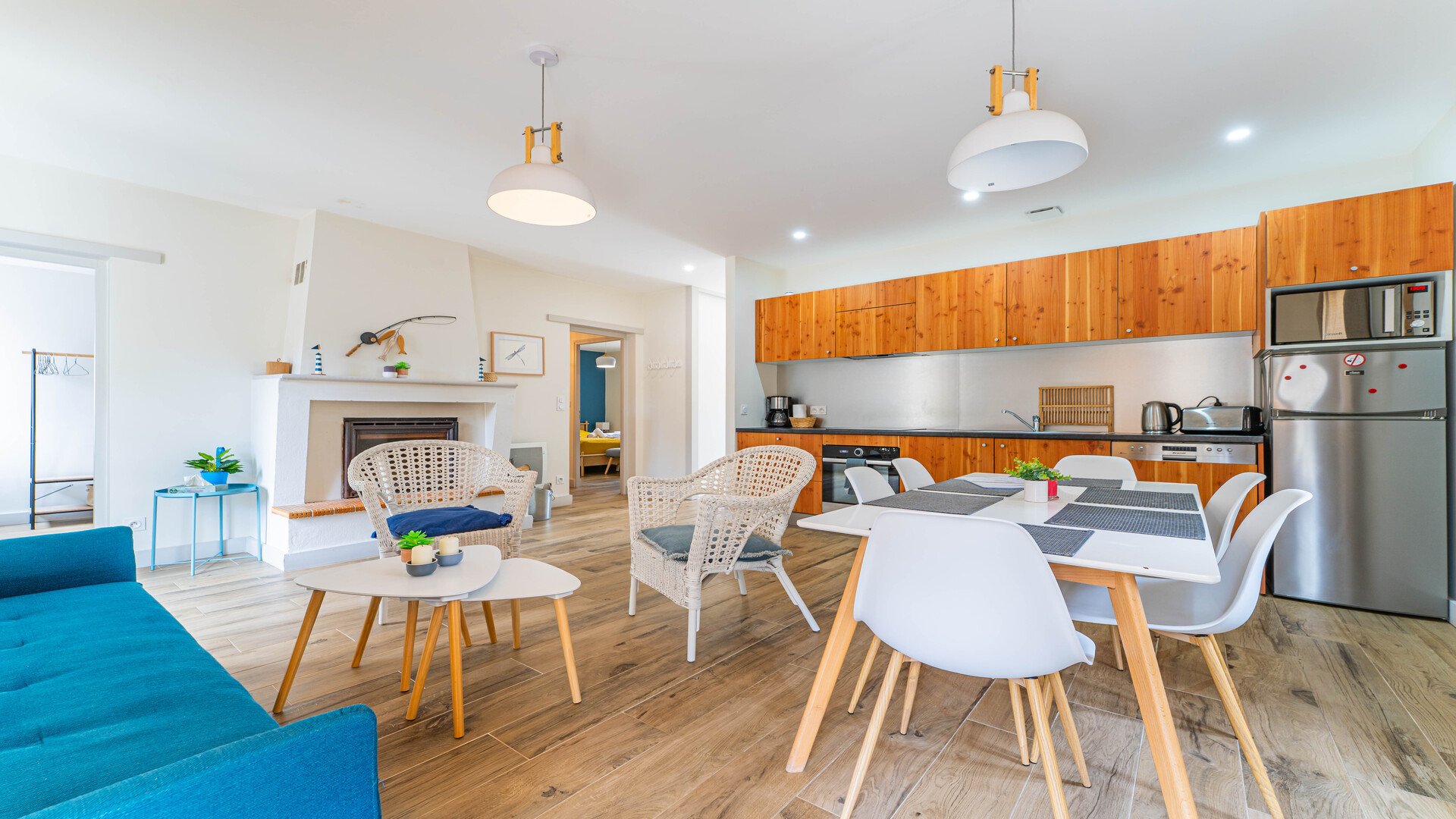 Living room with fitted kitchen, dining area and living room with insert fireplace (wood provided).