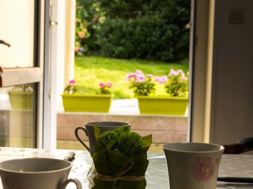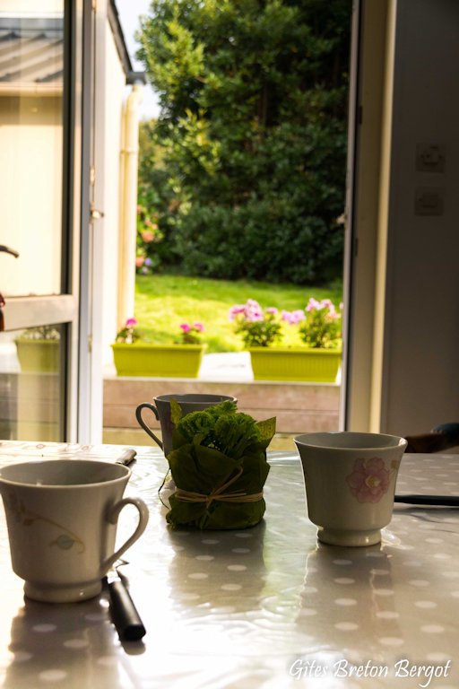Cozy rustic house facing south with, inside, a granite fireplace and Breton furniture.