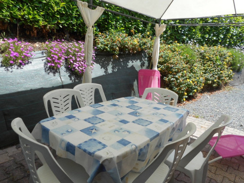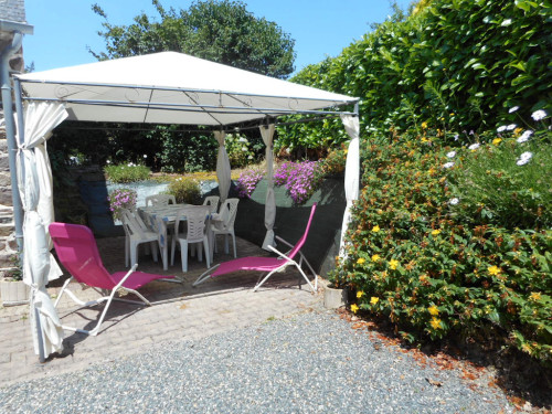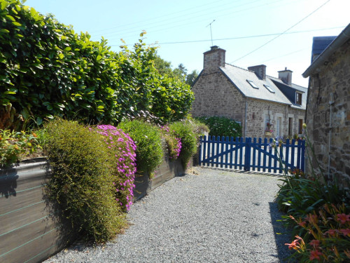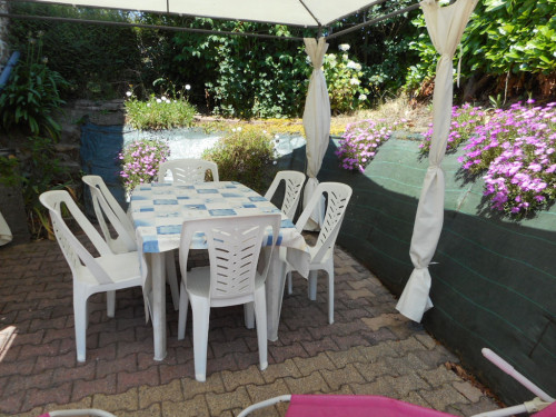 Extérieurs : cour et allée fleurie (peut être aussi parking), terrasse, salon de jardin, chaises longues, sous tonnelle.