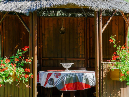 Cour, mobilier de jardin, bac à sable, portique, étang à truites clôturé, parc avec chèvres, ânes, moutons, poules, terrain de pétanque, trampoline.
