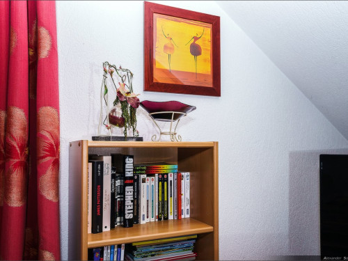 Gîte aménagé à l’étage d’une maison mitoyenne à celle du G 1374 située dans un cadre verdoyant, proche de forêt.