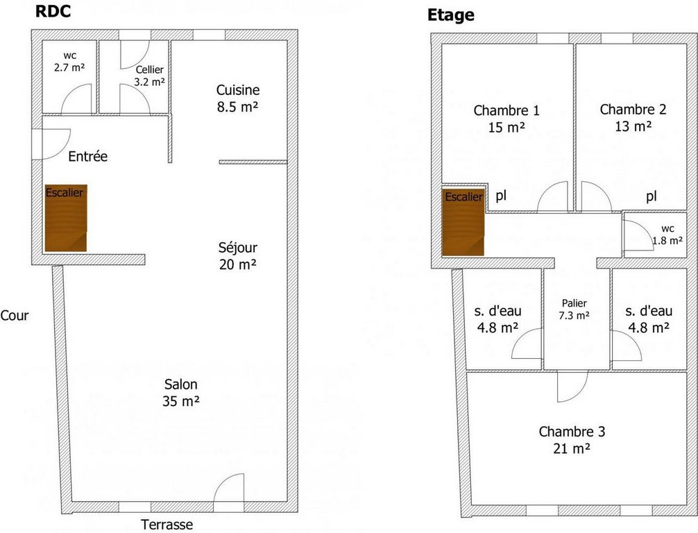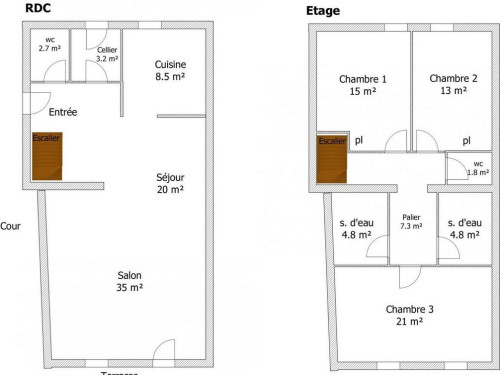 À l'étage : 1 chambre (1 lit en 140), 1 chambre (1 lit 160), 1 chambre (1 lit en 140, 2 lits en 90). 2 salles d'eau. 2 WC séparés.